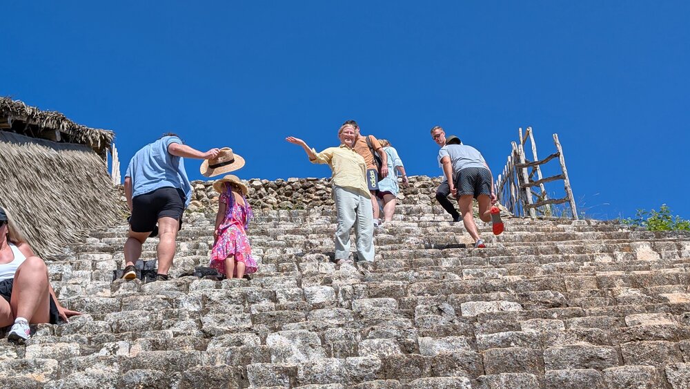 104. Amy climbing the Castillo, at EkāBalam. It was 30 meters high, or a climb of about 108 steps.