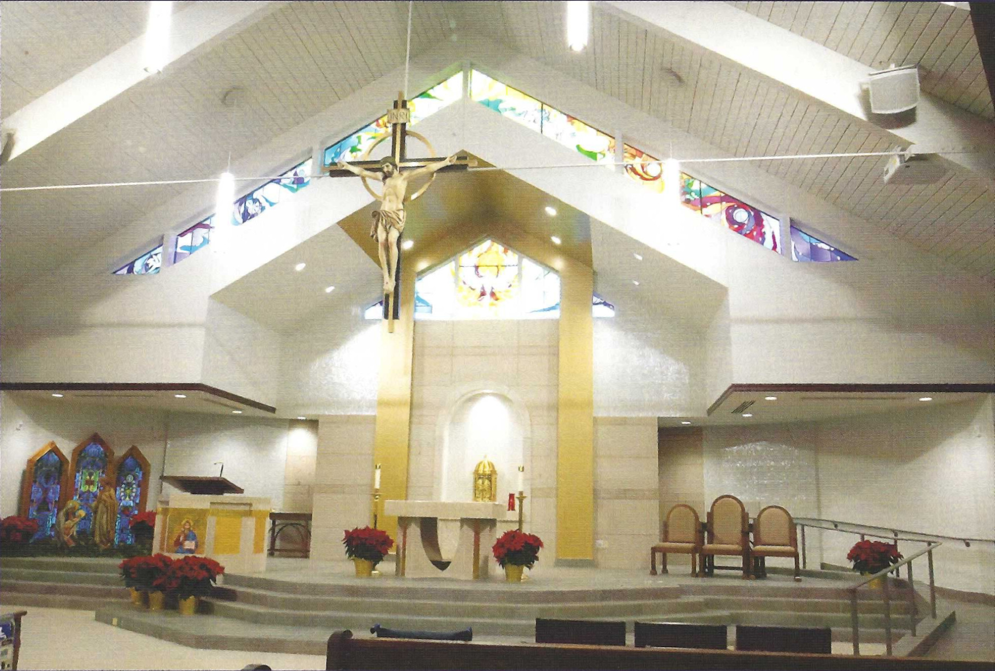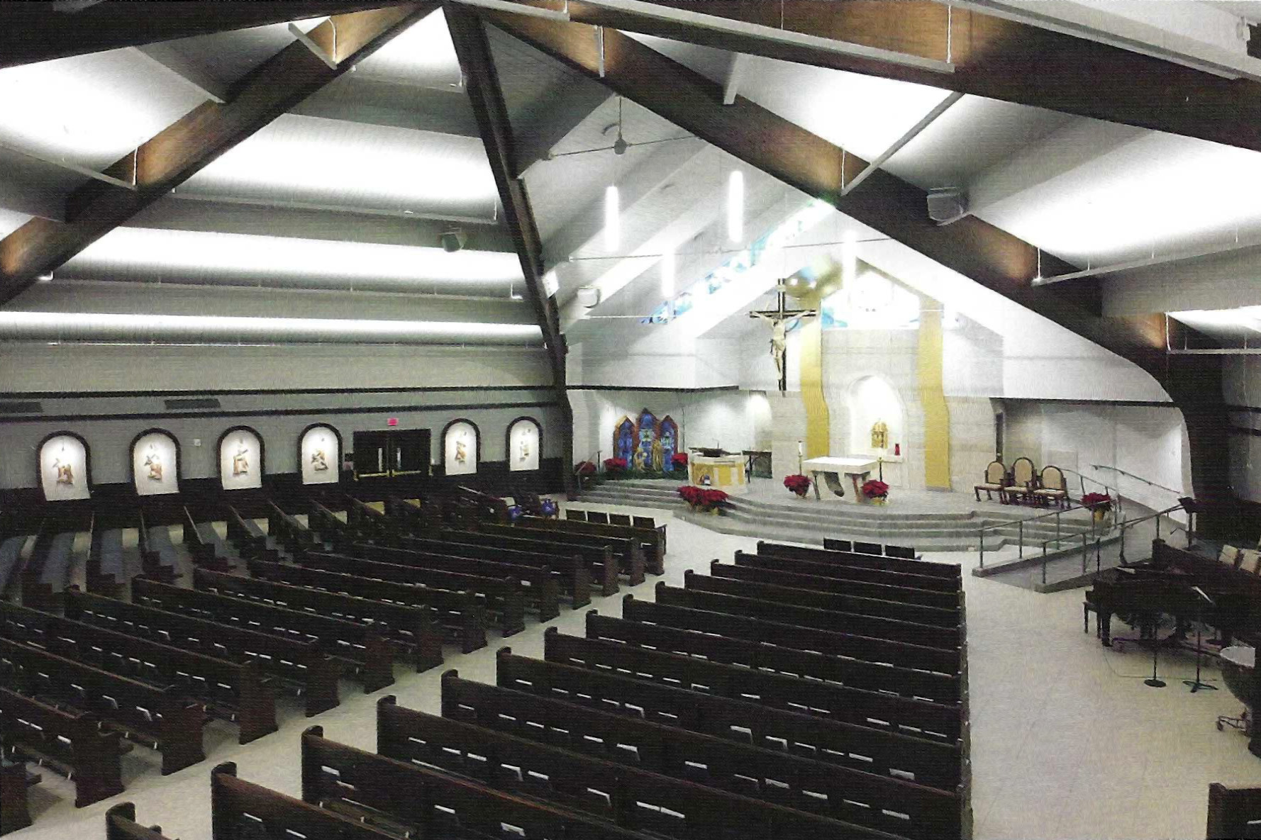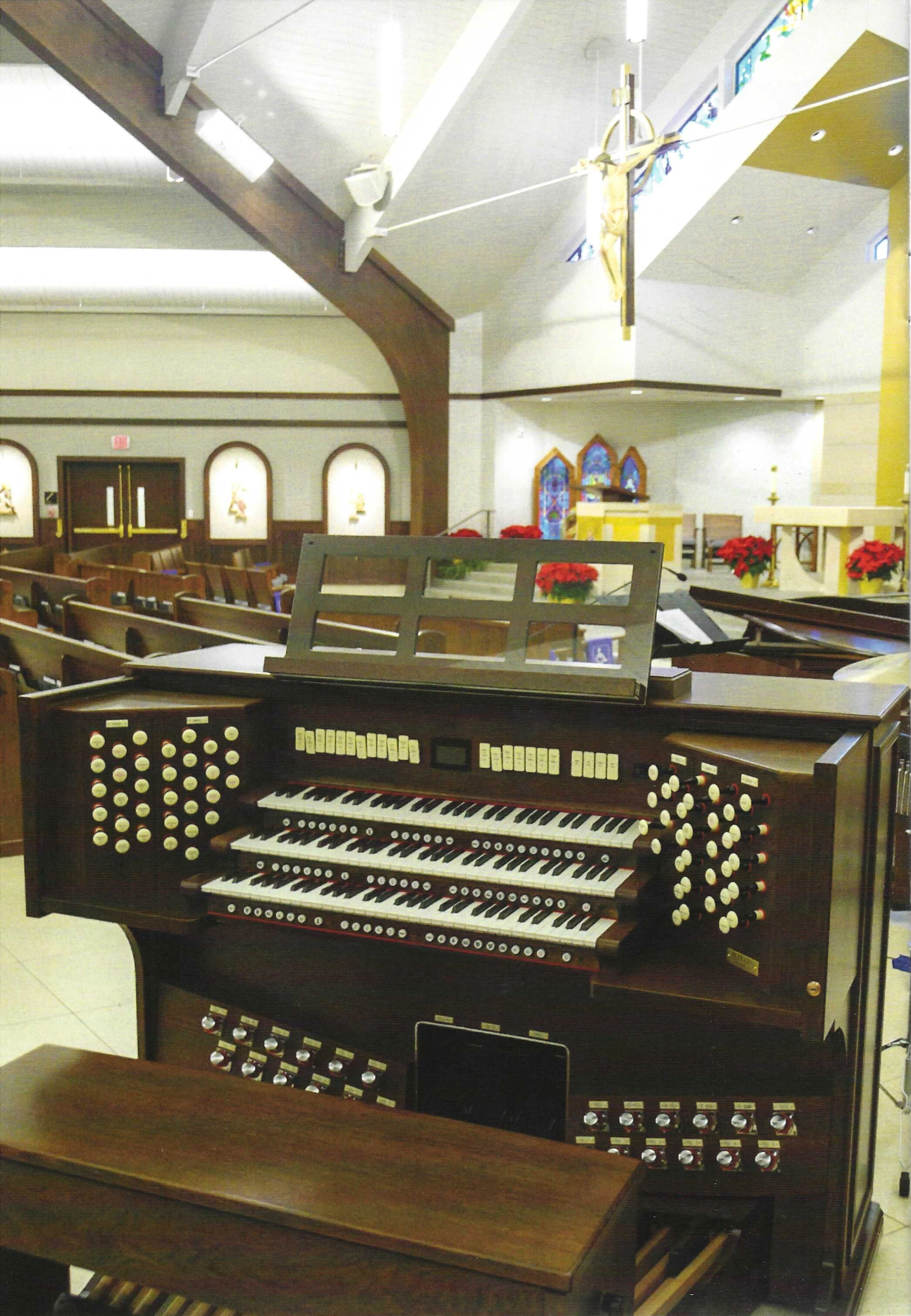 In addition to an expanded choir area, a piano, and other musical instruments, a new Rodgers Infinity 361 three manual digital organ resounds in Lumen Christi. The organ is capable of introducing fifty-nine orchestral voices. Sounds of trumpets, oboes, flutes, and even timpani can be added to the principal sounds of the organ. With the great advances in technology in recent years, the authenticity and the volume of sound provide a glorious addition to liturgical events. The digitally created sound rivals the sound of a traditional pipe organ. Speakers masterfully placed throughout the nave add to the acoustical brilliance of this instrument, creating a beautiful audio accompaniment that will enhance the sounds of all genres of music for years to come.
