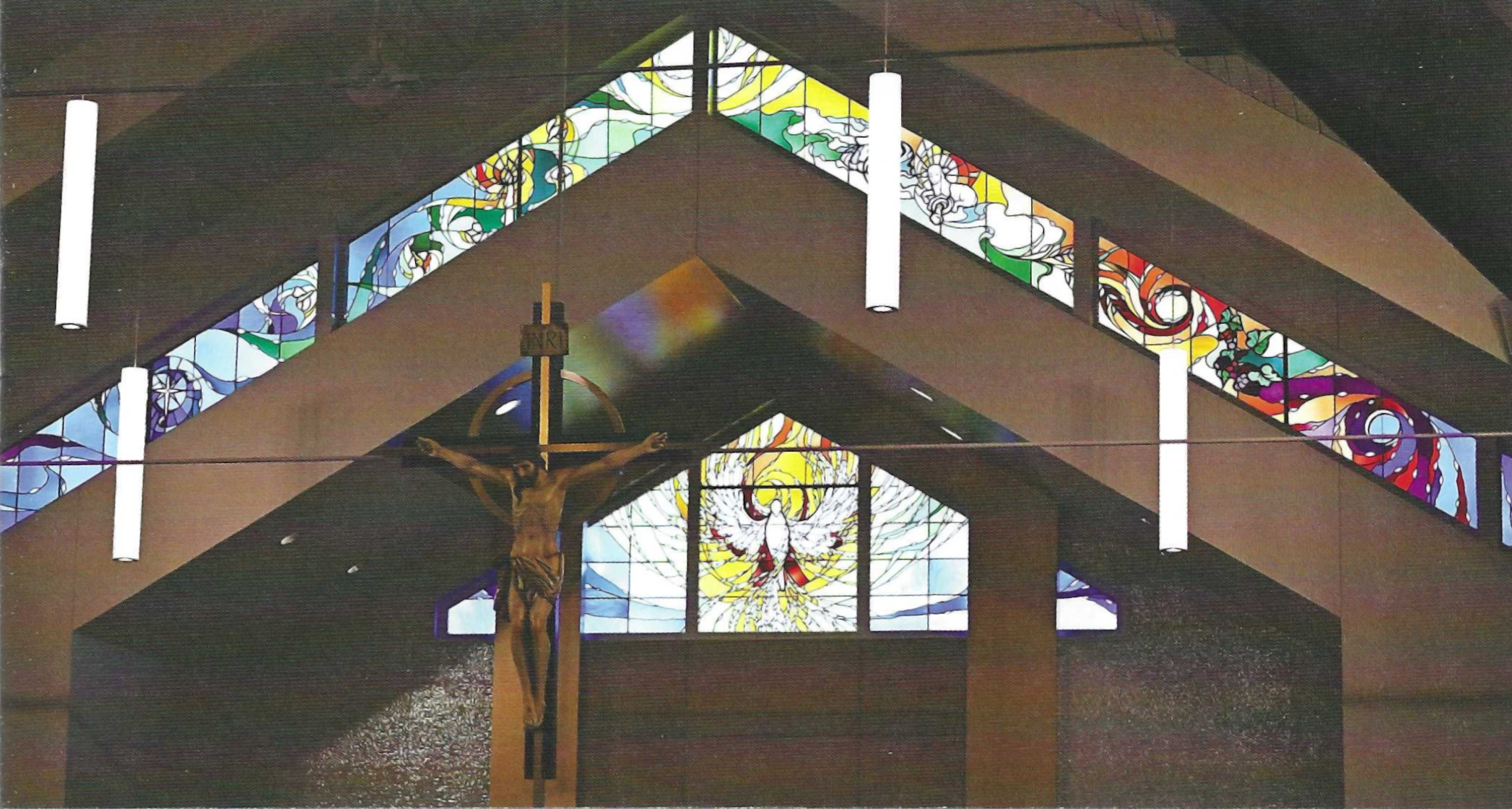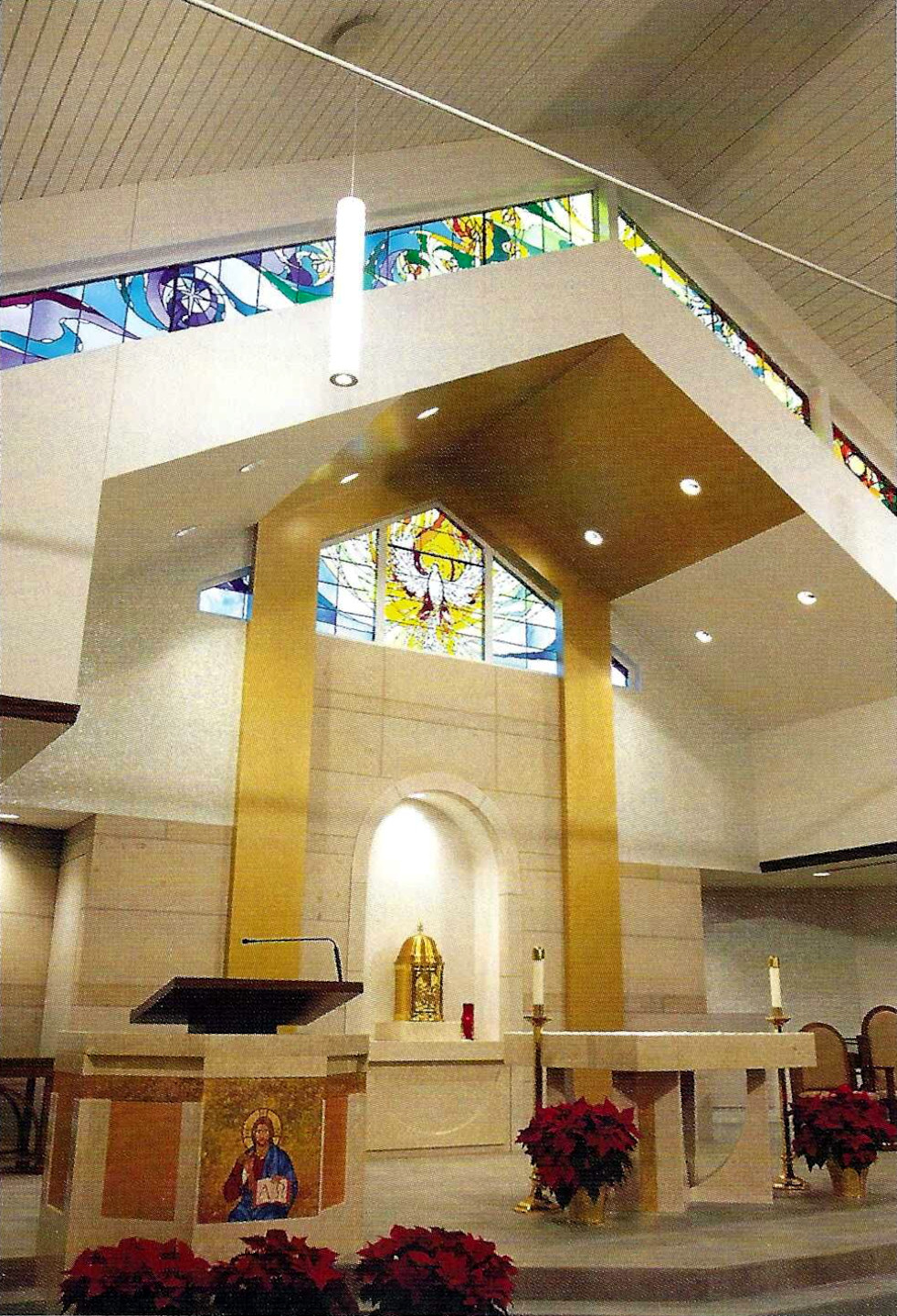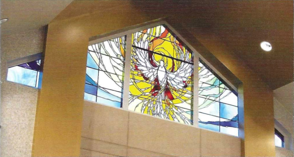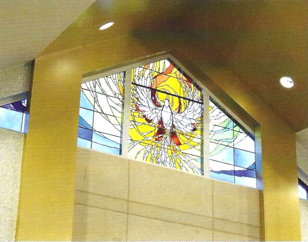 The Spiritus Window, directly above the tabernacle, celebrates the glory of the Holy Spirit, represented as a dove, illuminating the altar and shining forth the light of Christ. In Sacred Scripture, the image of light overcoming darkness is a powerful image of the presence of God. The spiral of warm light emerges as the breath or wind of the Holy Spirit; with no beginning and no end, it gives light and life to all creation. The chevron-shaped windows above the tabernacle celebrate light in each of the four seasons of the year.