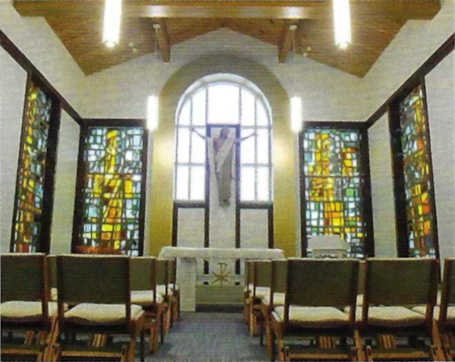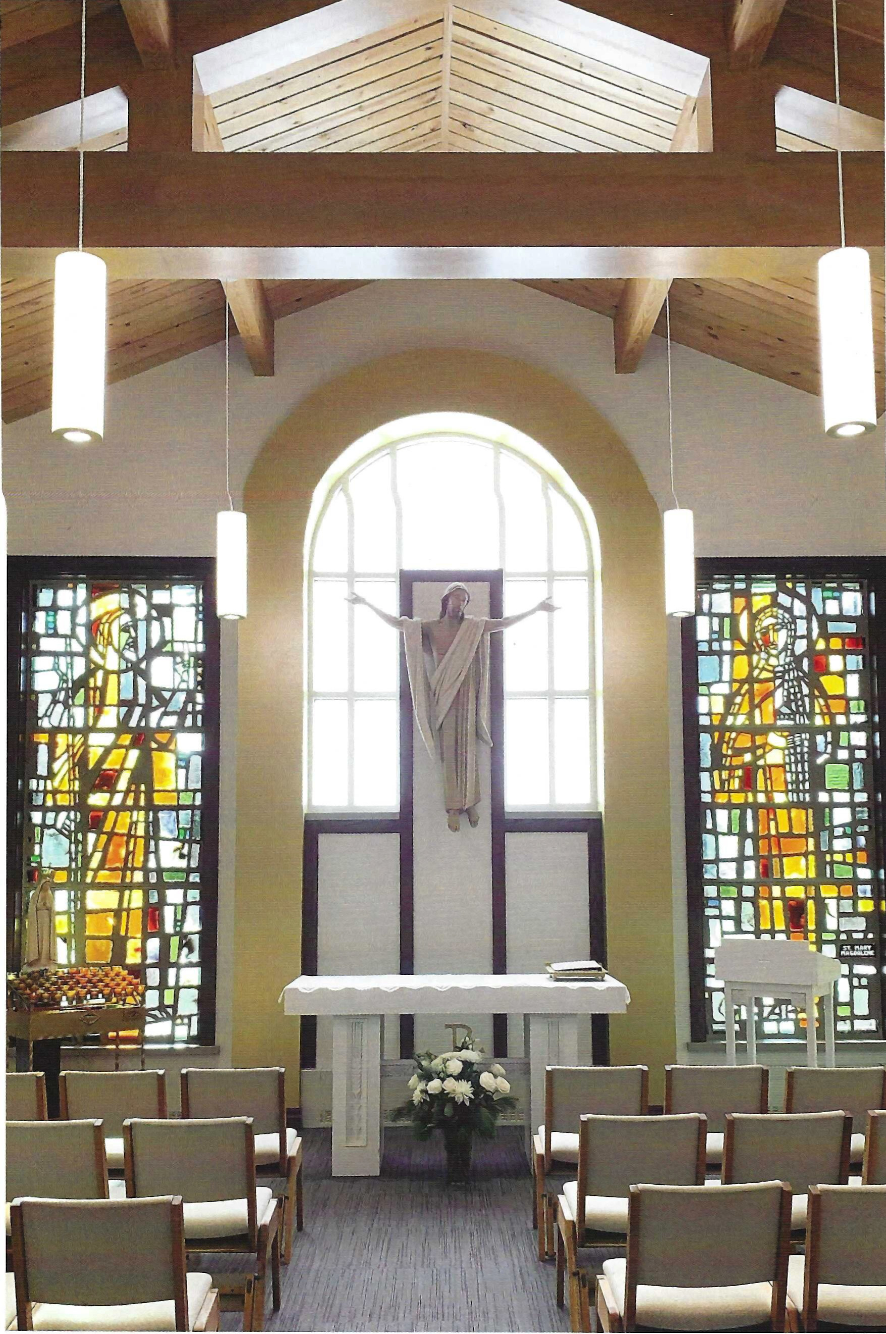 The Lumen Christi chapel extends to the south toward Mequon Road. Its walls contain four of the eight original stained glass windows from St. James Church. The other four windows can be found along the wall entering St. Cecilia Hall. The chapel is set aside for quiet, private, more intimate prayer as well as small liturgical celebrations. Since private prayer often flows from a spontaneous response to God's voice amidst the noise of the world, much consideration was given to making this space available at all times. Therefore, a secured private entrance allows for twenty-four hour access for personal prayer. This space holds the potential for twenty-four hour Eucharistic Adoration, allowing parishioners to visit with Our Lord as he is present in the Most Holy Eucharist.