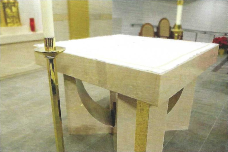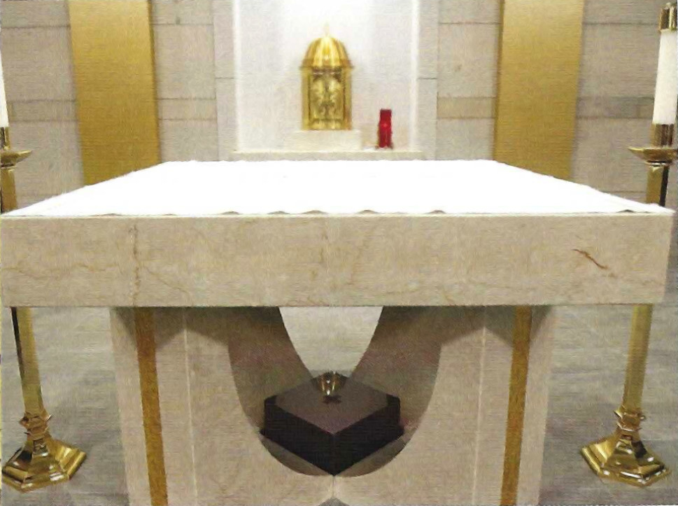 The altar of Lumen Christi, dedicated in December of 2019, is the focal point of the sanctuary. Set at the top level of the tiled sanctuary floor, the square shape of the mensa, or tabletop, follows the ancient design of church altars. A curved interlocking set of four marble arms supports the mensa. The shape of these four supports suggests the orans posture of prayer assumed by the celebrant—arms held wide, palms up. Golden mosaic tiles as in the design of the baptismal font extend down from the tabletop to the floor. Beneath the altar rests a red granite ossuary, a depository for the relic remains of six venerable saints: St. Philomena, St. John Vianney, St. Blaise, St. Jude, St. Francis of Assisi, and St. Teresa of Avila. The relics of St. Blaise and St. Jude were formerly enclosed in the St. James altar.