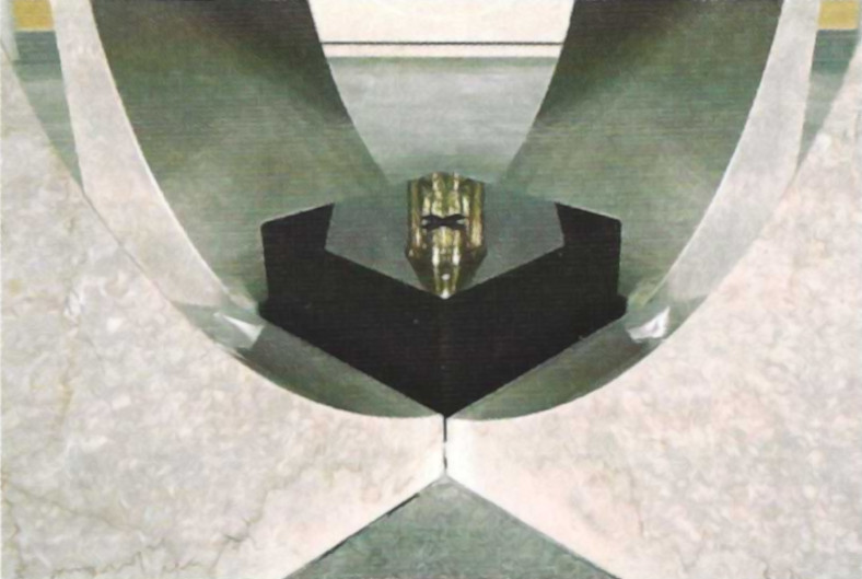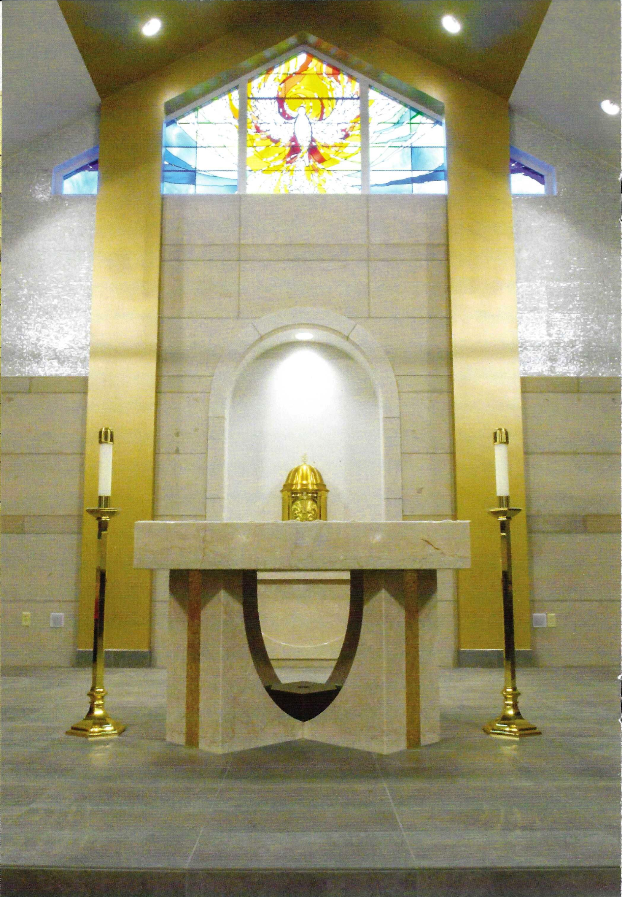 The Lumen Christi tabernacle was formerly located in the St. Cecilia sanctuary. The tabernacle now stands upon a marble base in an arched niche directly behind the main altar, aligning with the Roman Missal requisite that it be in a prominent and conspicuous place. The wall of the niche, designed as a mosaic, appear as a halo of light surrounding the dwelling place of God. The halo of light is a ring of adoring angels, nine in total, representing the nine choirs of spiritual beings surrounding the throne of God: Seraphim, Cherubim, Thrones, Dominions, Virtues, Powers, Archangels, Principalities, and Angels.