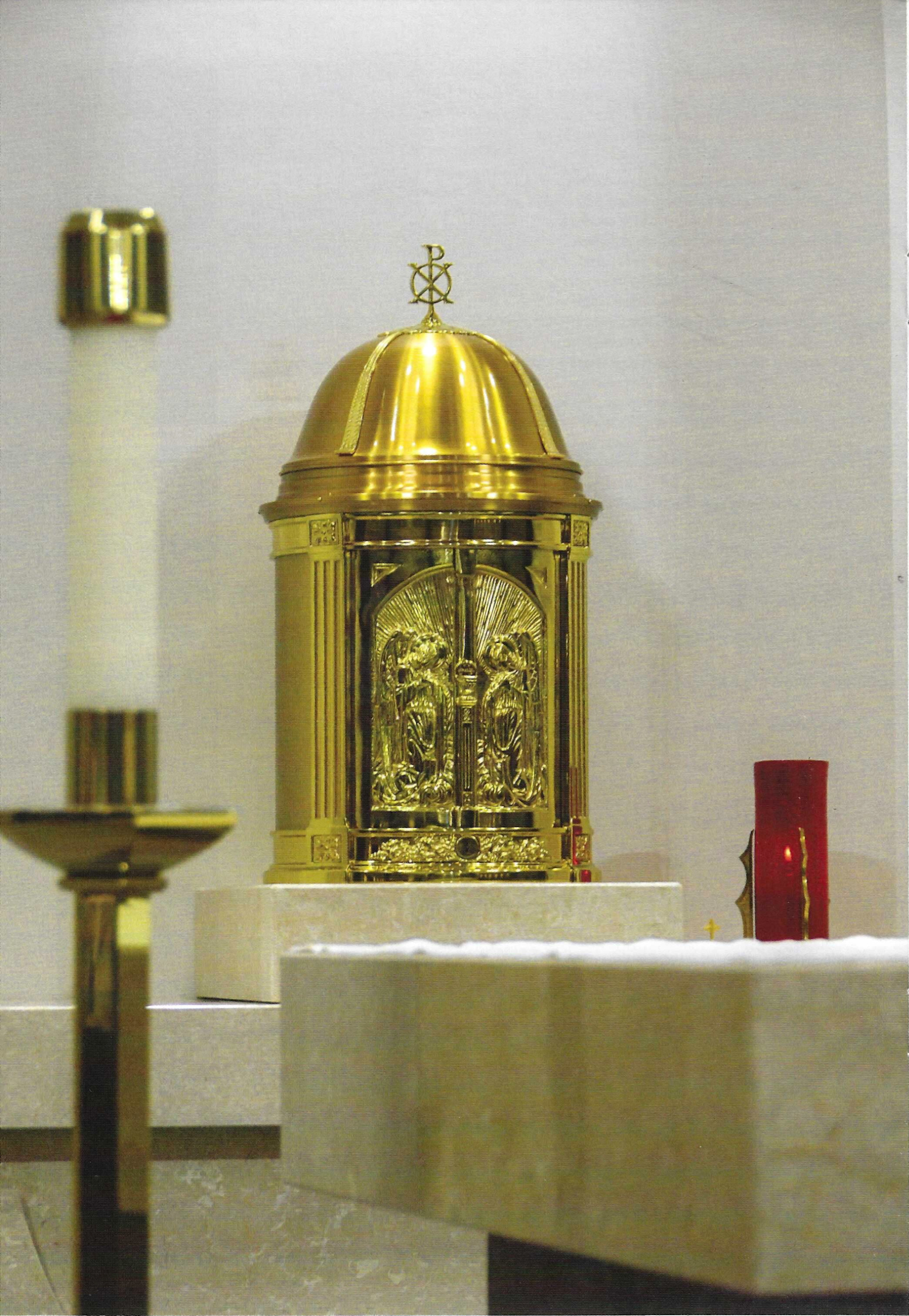 The word tabernacle comes from the Latin word tabernaculum, meaning tent. In the Old Testament, this referred to the portable Ark of the Covenant which carried the stone tablets of the ten commandments. It was believed that the Ark contained the presence of the Lord, the Lord God. Today the tabernacle is the place for the reservation of the Most Holy Eucharist.