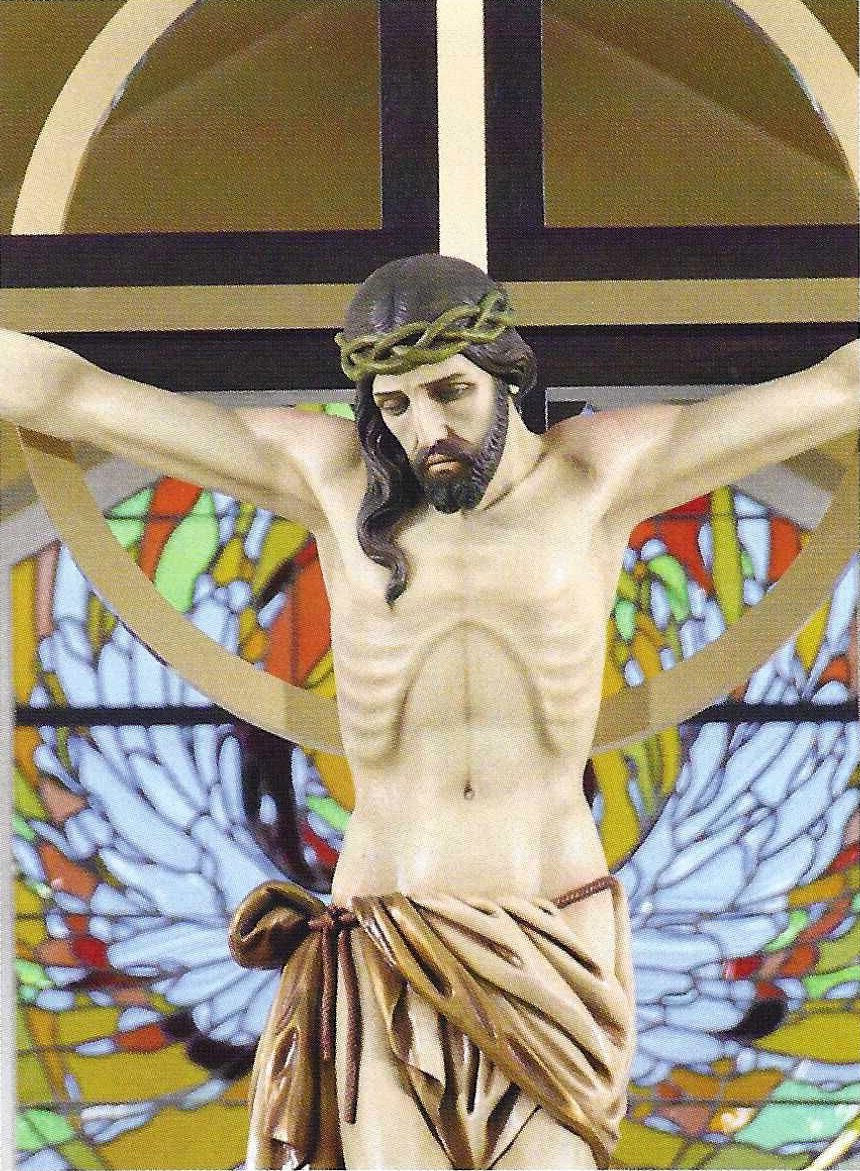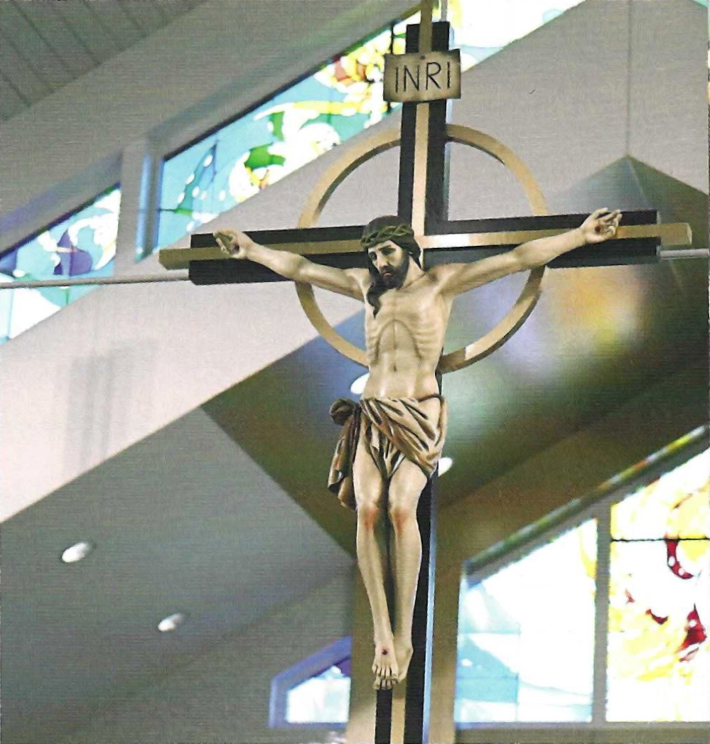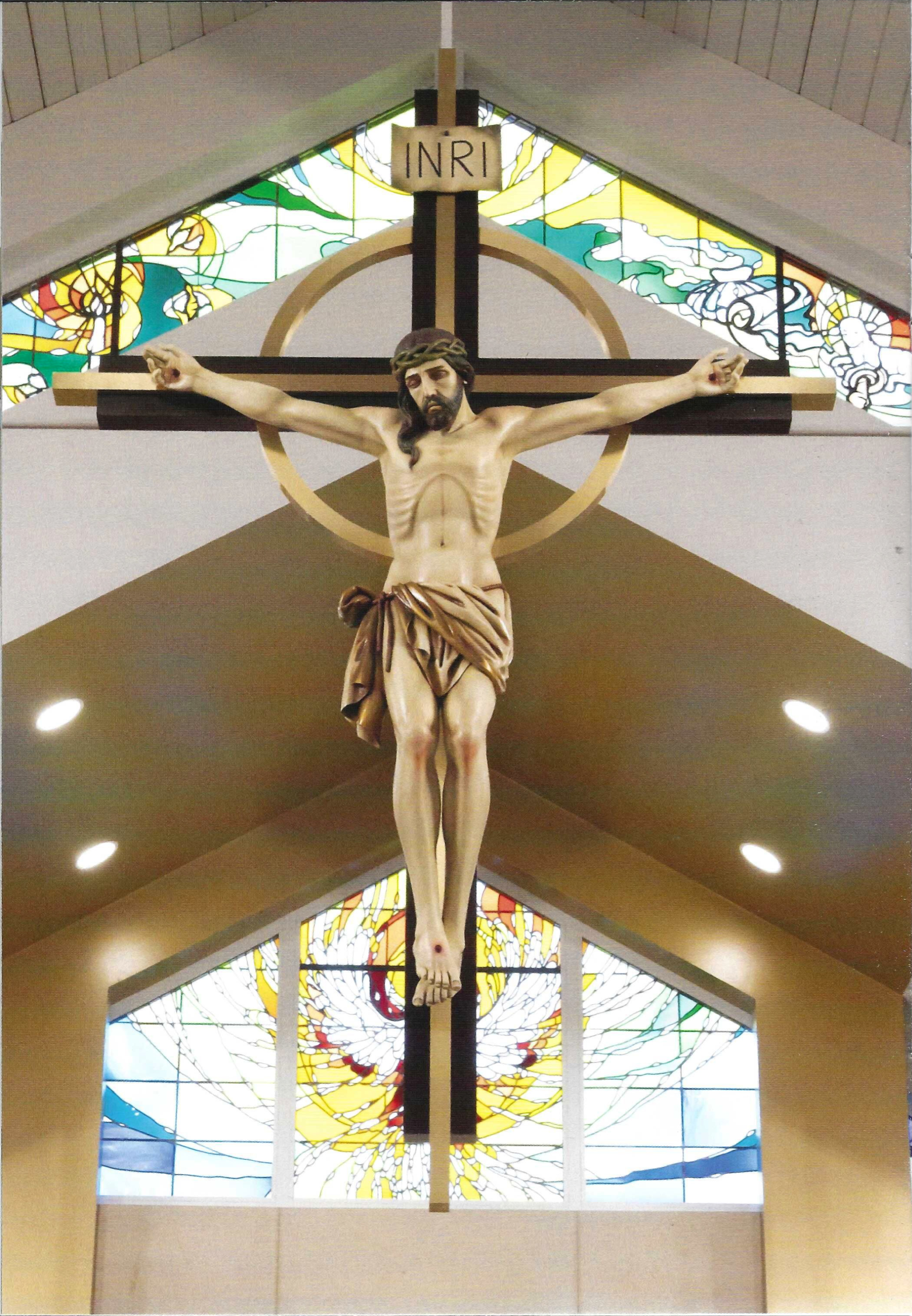 The image of Christ Crucified, the Anointed One who was sacrificed, is clearly visible to all who worship at Lumen Christi Parish. The nine-foot tall crucifix, locally designed and crafted, is suspended over the altar steps. Since the tenth century, the crucifix has held a place of priority in Catholic churches. The sacrifice of Christ is celebrated on the altar every time we gather for the Eucharist.