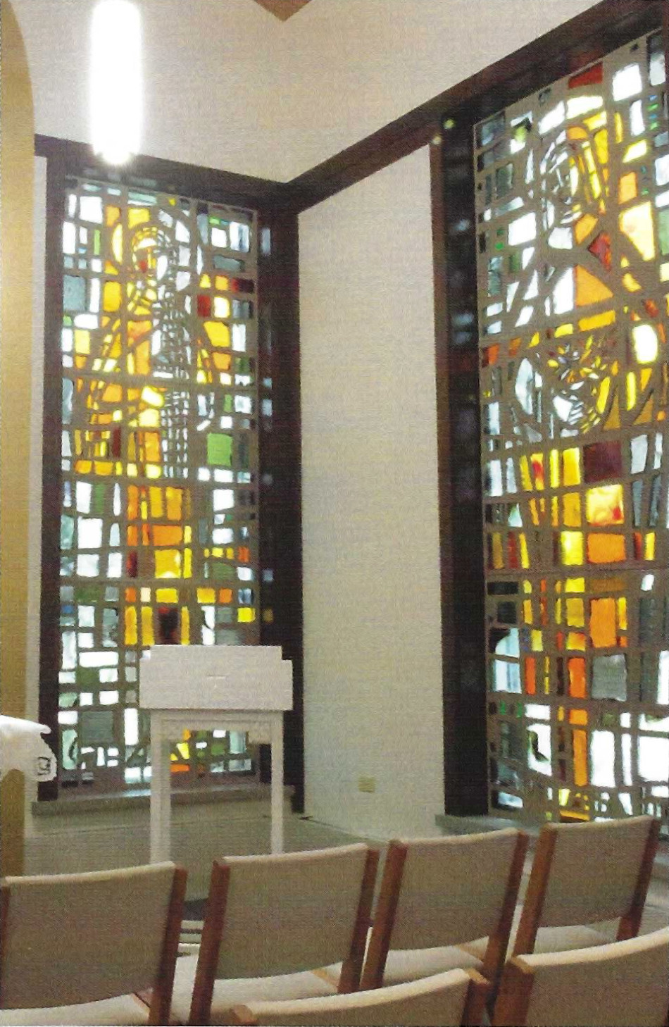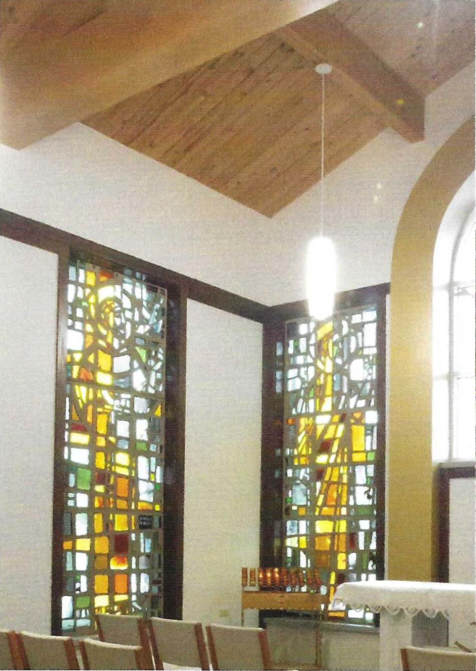 Beginning in the lower left is the darkness of winter shattered by the symbolic white lily of Our Lady at the Annunciation (Luke 1:26-28). From there, the colors flow from midnight blue through the steely gray-blues of winter until, once again, they are pierced by the Star at the winter solstice. Here the light increases as the colors begin to soften and warm. As they flow from the star upwards, soft golden light emerges; early spring greens appear amidst a sunrise glow. The Paschal candle, formed with beeswax, burns and glows as the Light of Christ with bees swirling in the breath of the Holy Spirit (The Exultet). Here the golds deepen and the greens strengthen at the top center of the window. The summer solstice, the brightest point, flows into deeper, richer of summer. A shell, with water flowing, and a scroll emerge representing St. John the Baptist. These images recall his words upon seeing the Christ: Behold the Lamb of God, who takes away the sin of the world (John 1:29). John testifies as a witness to the Light through the power of the Holy Spirit, the swirling breath that continues to flow and unify the windows. As summer turns to fall, the golds deepen and the multi-hued colors of autumn reach their peak in the wheat, the symbol of the Bread of Life, as Brother Sun glows (Canticle of St. Francis). The intense colors begin to fade and the background deepens as Sister Moon crests in the darkness (Canticle of St. Francis). The bottom of the right side reflects the color balance of the left. Once again winter solstice encroaches, bringing the chevron window full circle as the Light of Christ throughout the seasons of the Church year.