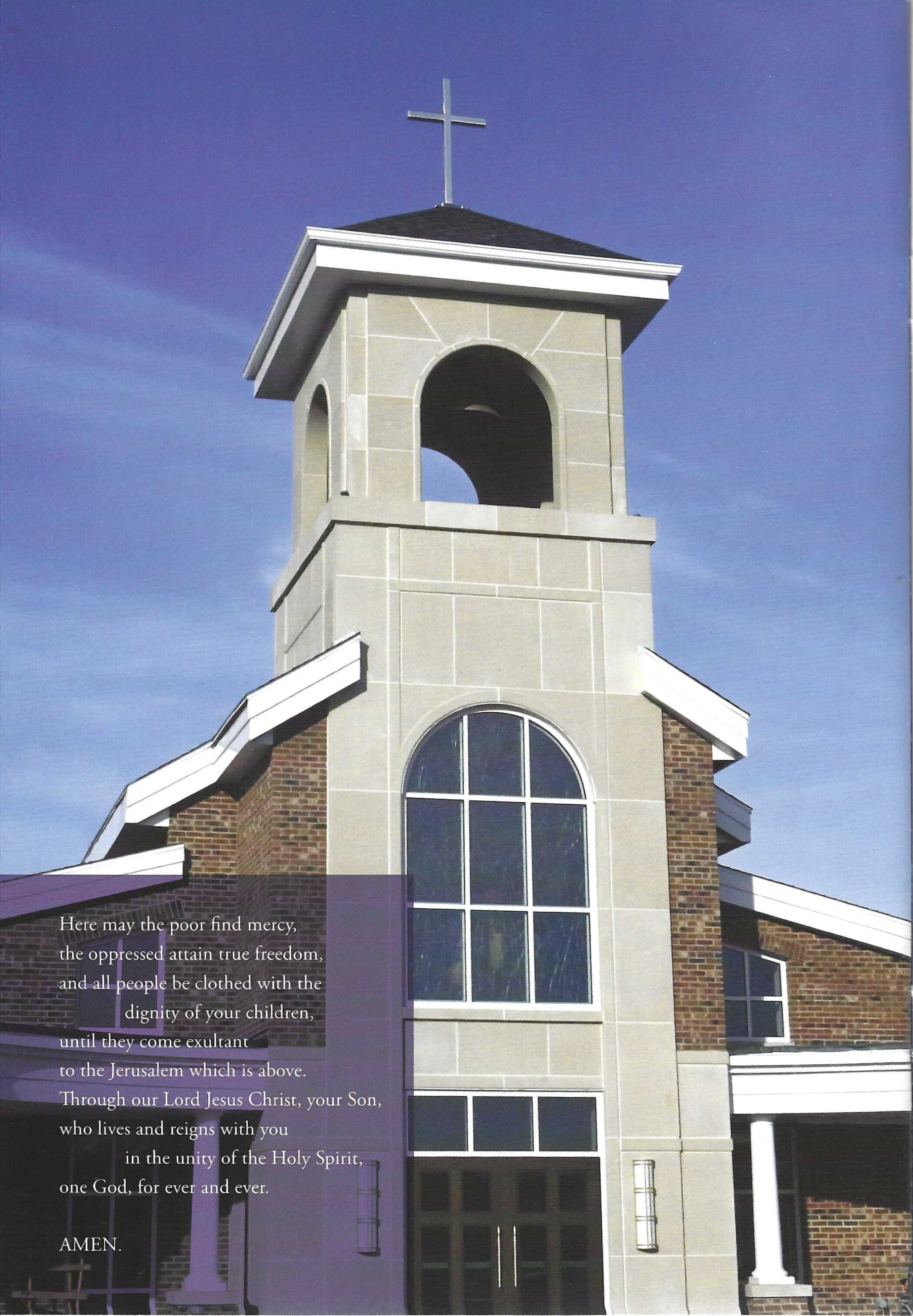 Here may the poor find mercy, the oppressed attain true freedom, and all people be clothed with the dignity of your children, until they come exultant to the Jerusalem which is above. Through our Lord Jesus Christ, your Son, who lives and reigns with you in the unity of the Holy Spirit, one God, for ever and ever.