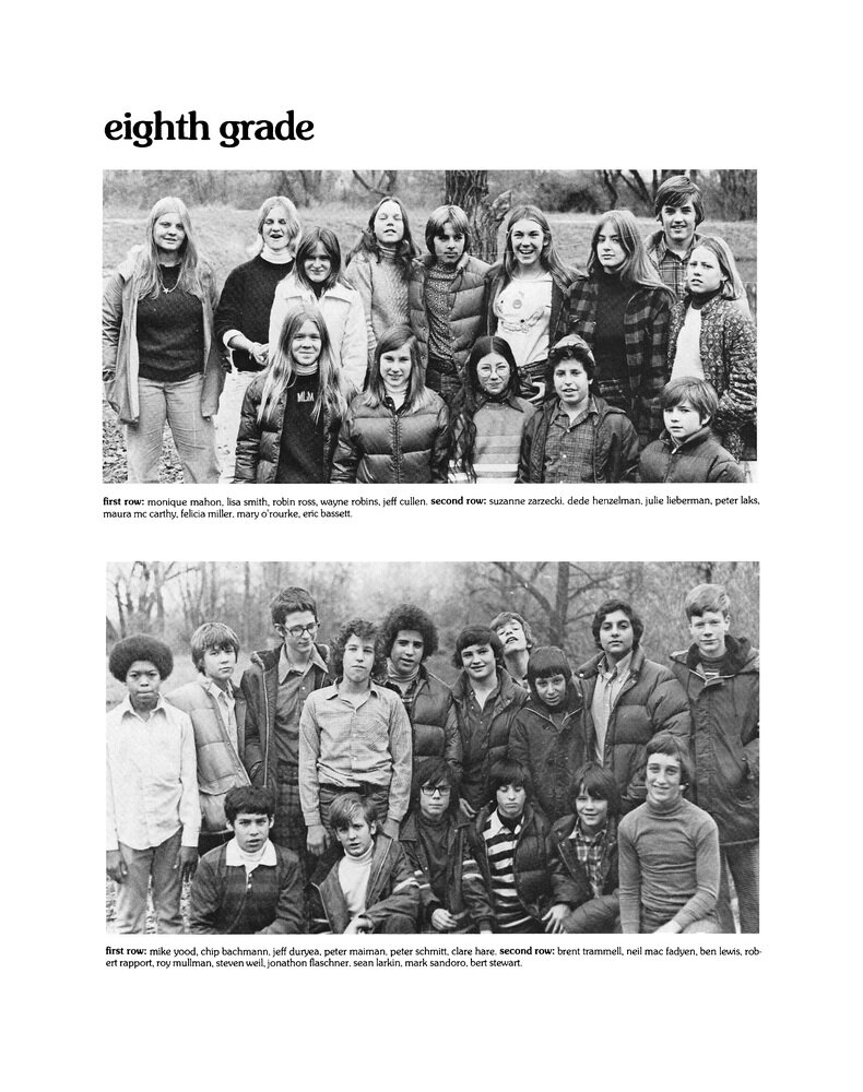 | 44. Eighth Grade; First Row: Monique Mahon, Lisa Smith, Robin Ross, Wayne Robins, Jeff Cullen. Second Row: Suzanne Zarzecki, Dede Henzelman, Julie Lieberman, Peter Laks, Maura Mc Carthy, Felicia Miller, Mary O’rourke, Eric Bassett. First Row: Mike Yood, Chip Bachmann, Jeff Duryea, Peter Maiman, Peter Schmitt, Clare Hare. Second Row: Brent Trammell, Neil Mac Fadyen, Ben Lewis, Robert Rapport, Roy Mullman, Steven Weil, Jonathon Flaschner, Sean Larkin, Mark Sandoro, Bert Stewart. | ||