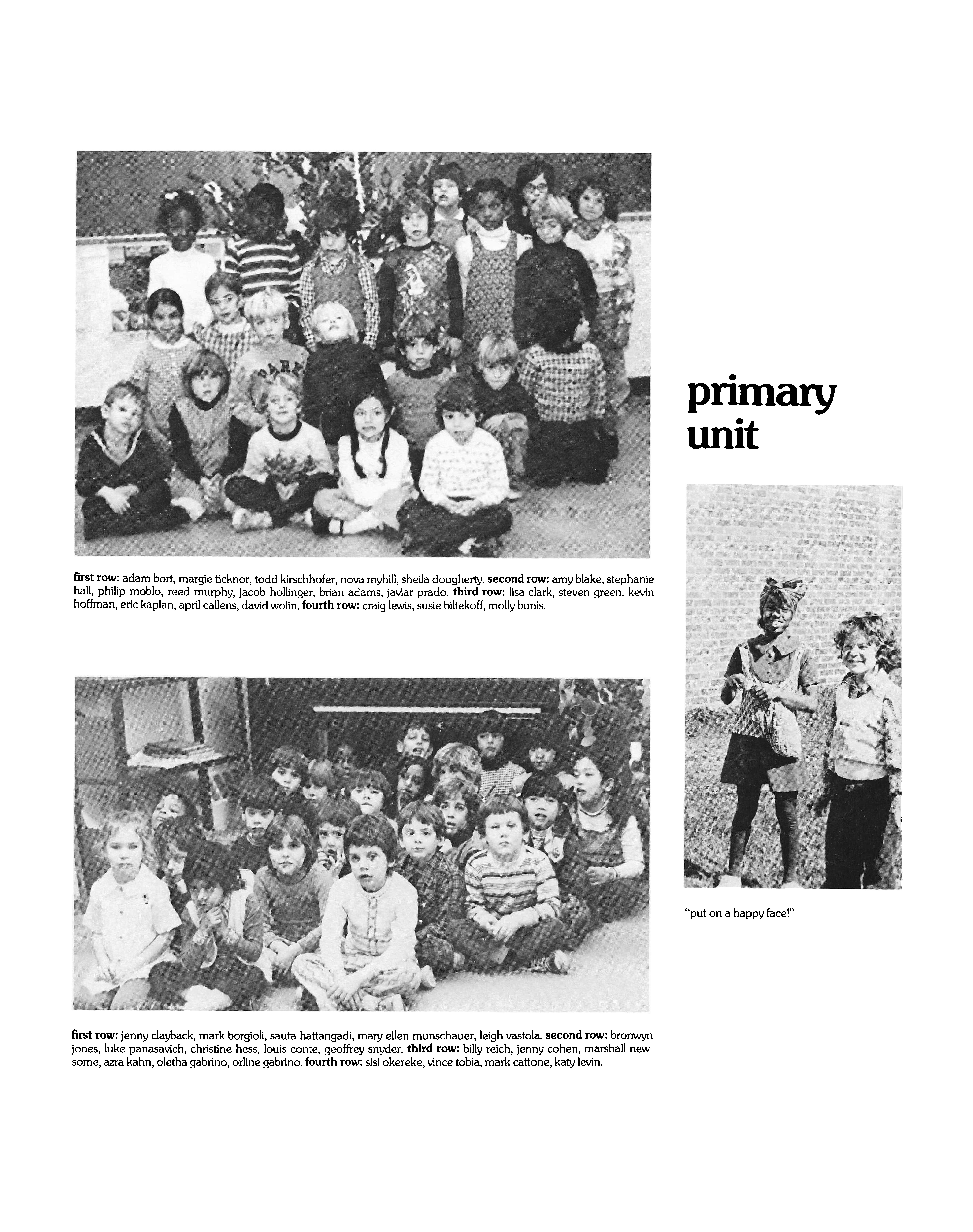 | 59. Primary Unit: First Row: Adam Bort, Margie Ticknor, Todd Kirschhofer, Nova Myhill, Sheila Dougherty. Second Row: Amy Blake, Stephanie Hall, Philip Moblo, Reed Murphy, Jacob Hollinger, Brian Adams, Javiar Prado. Third Row: Lisa Clark, Steven Green, Kevin Hoffman, Eric Kaplan, April Callens, David Wolin. Fourth Row: Craig Lewis, Susie Biltekoff, Molly Bunis. First Row: Jenny Clayback, Mark Borgioli, Sauta Hattangadi, Mary Ellen Munschauer, Leigh Vastola. Second Row: Bronwyn Jones, Luke Panasavich, Christine Hess, Louis Conte, Geoffrey Snyder. Third Row: Billy Reich, Jenny Cohen, Marshall Newsome, Azra Kahn, Oletha Gabrino, Orline Gabrino. Fourth Row: Sisi Okereke, Vince Tobia, Mark Cattone, Katy Levin. | |