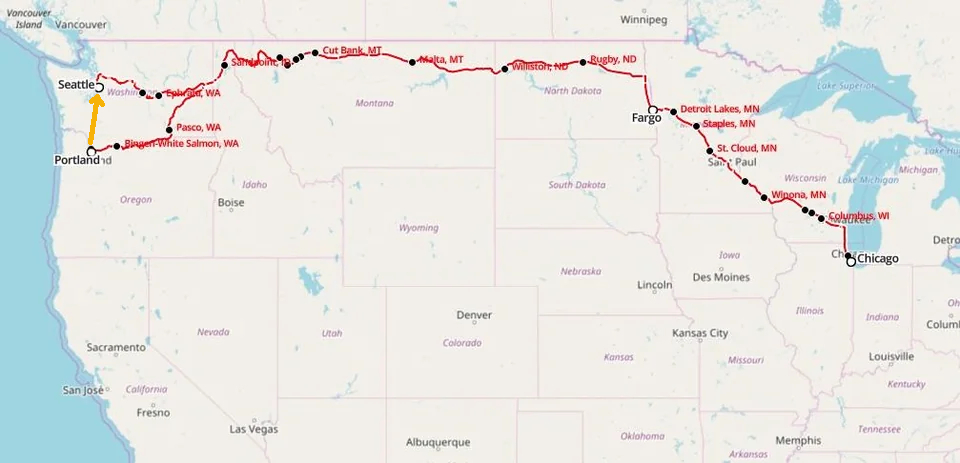 3. Map of the route taken by the Empire Builder. We boarded in Milwaukee and deboarded in Portland. The next day we reboarded Amtrak from Portland to Seattle (