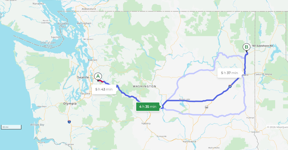 136. Our route from Issaquah to Sacheen Lake. (image created on Mapquest)