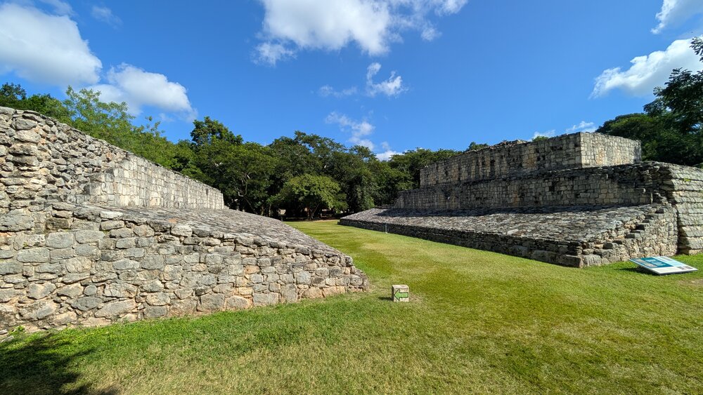 | 116. The ball court. The rings are missing. In case you do not know, the players used a heavy rubber ball, they can only hit the ball with their hip, and it had to go through the ring stationed about 15 feet off the ground. Some games went on for days. In some cases, the winner was sacrificed: considered an honor. | ||