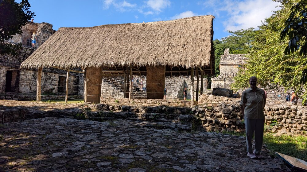 123. Amy stands outside a thatched room which protects two tall Stellae.