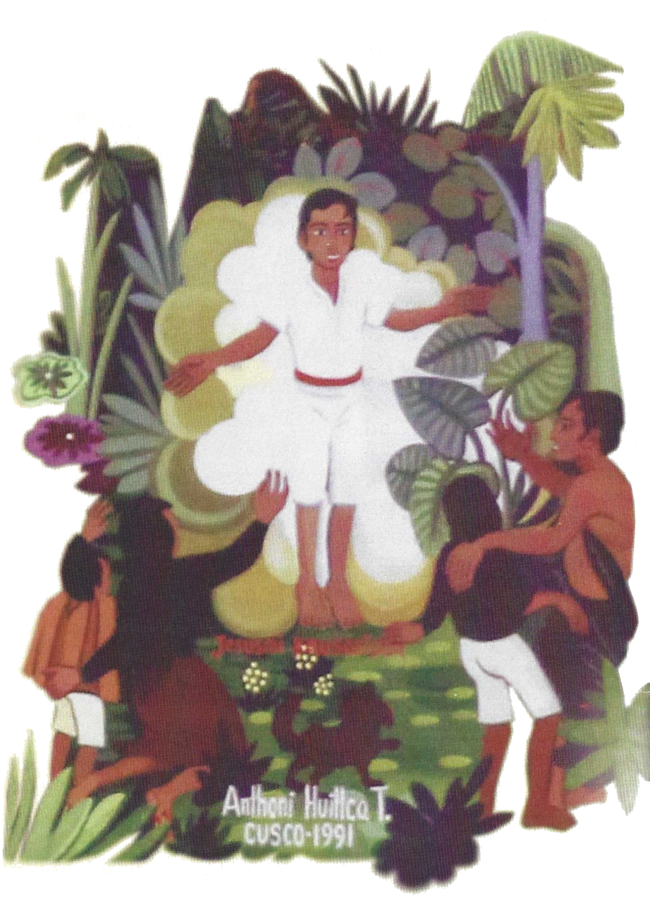 Anthoni Huillca is the second son of famous Quechua artist Antonio Huillca, who originated the naif school of Peruvian painting. Two of Anthoni's brothers have also developed their artistic skills. The family has had expositions in Mexico, Chile and France. Quechua Way of the Cross is one of a series of paintings that the family has recently unveiled to commemorate the quincentennial of Columbus’ arrival in the Americas from the perspective of indigenous peoples.