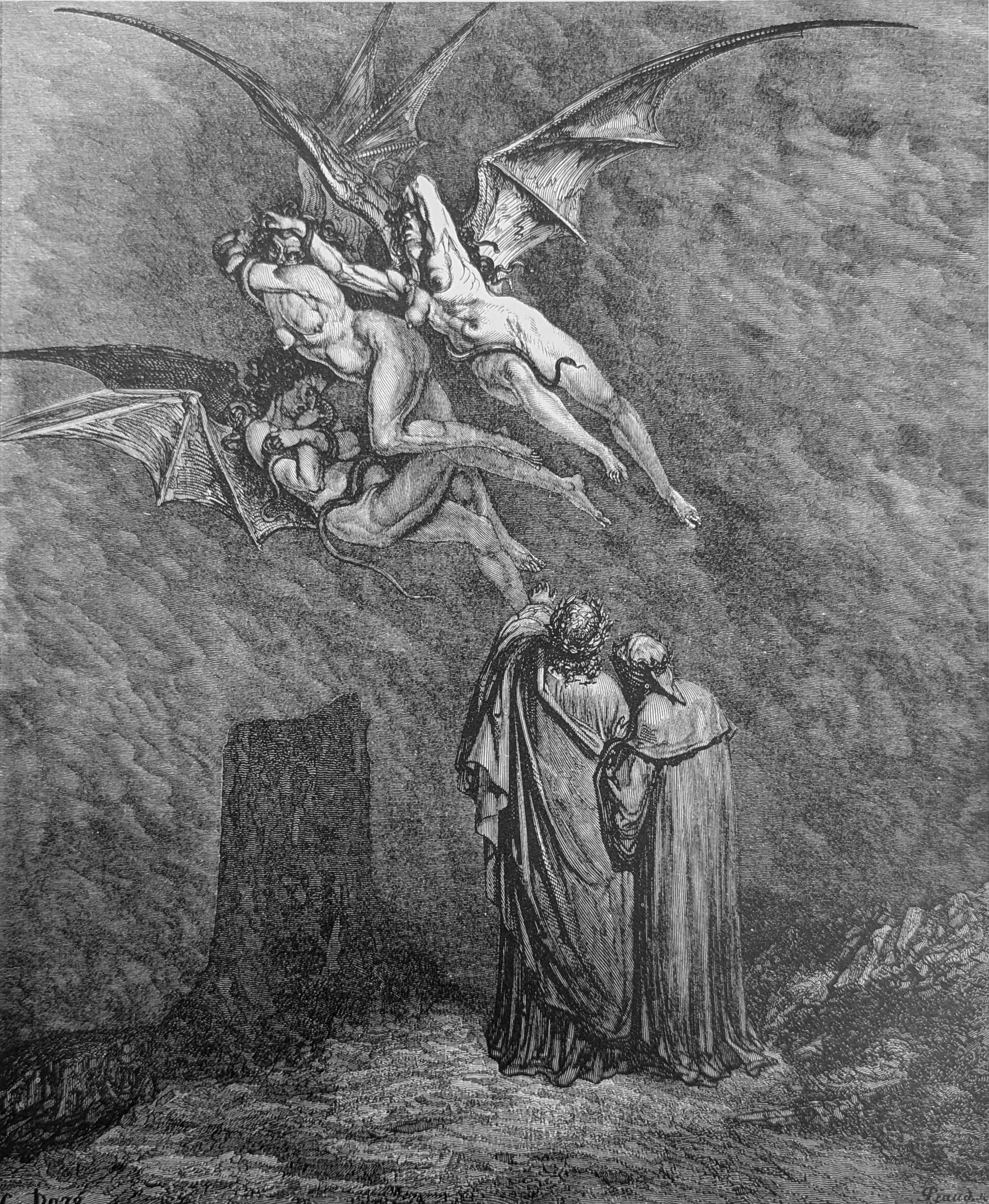 "This is Megaera, on the left-hand side; / She who is weeping on the right, Alecto; / Tisiphone is between;" Inf. IX, lines 46-48