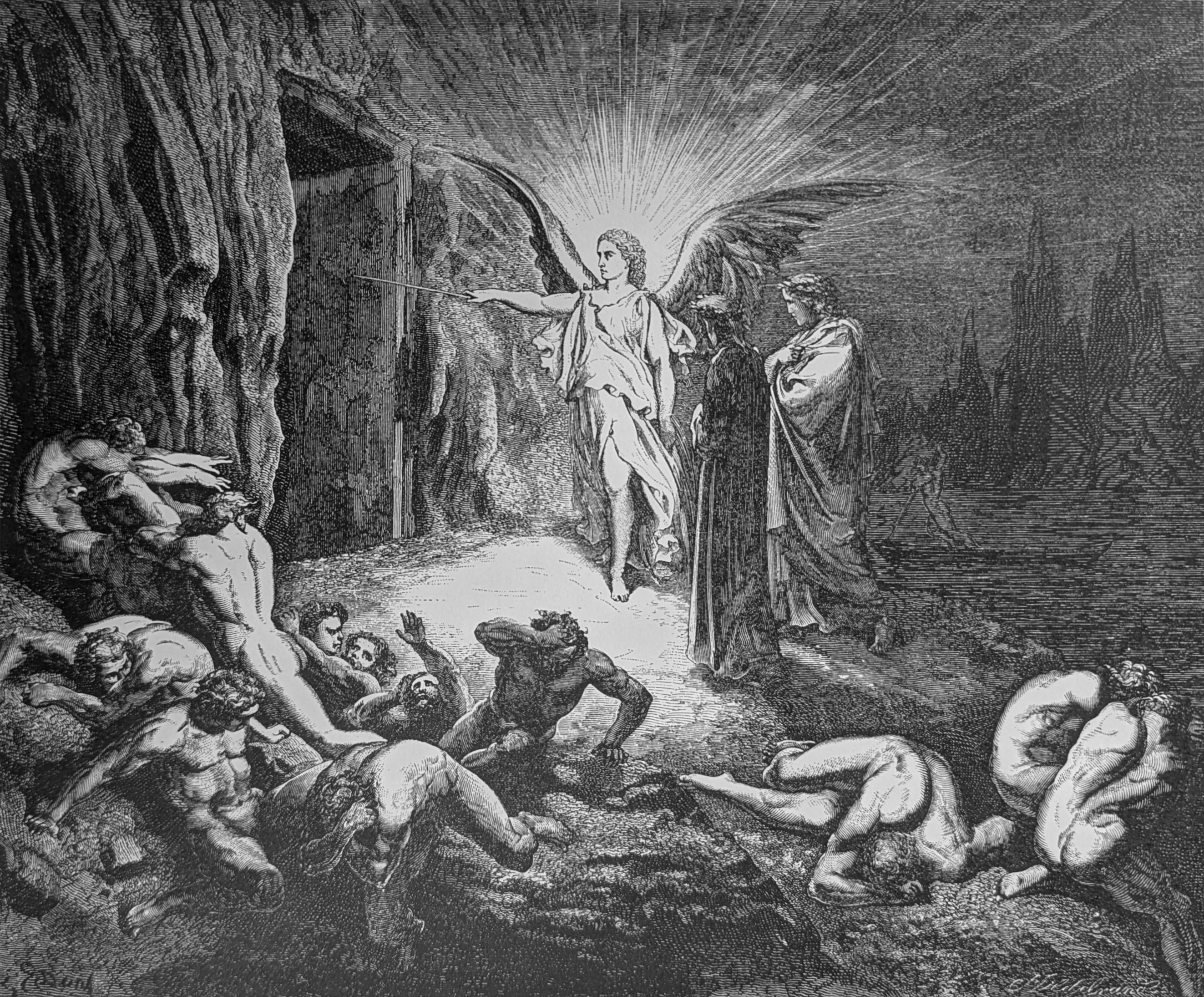 The poets are waiting for Divine assistance at the gate of Dis. Unnerved by Virgil's anxiety, Dante asks him if he knows the way through Hell. Virgil reassures him. Three Furies appear at the tower, shrieking and tearing at their breasts and invoking Medusa. Dante shields his gaze to avoid being turned to stone. An angel makes a dramatic entrance before opening the gate. The sarcophagi of the groaning Heretics burn beyond.[1]