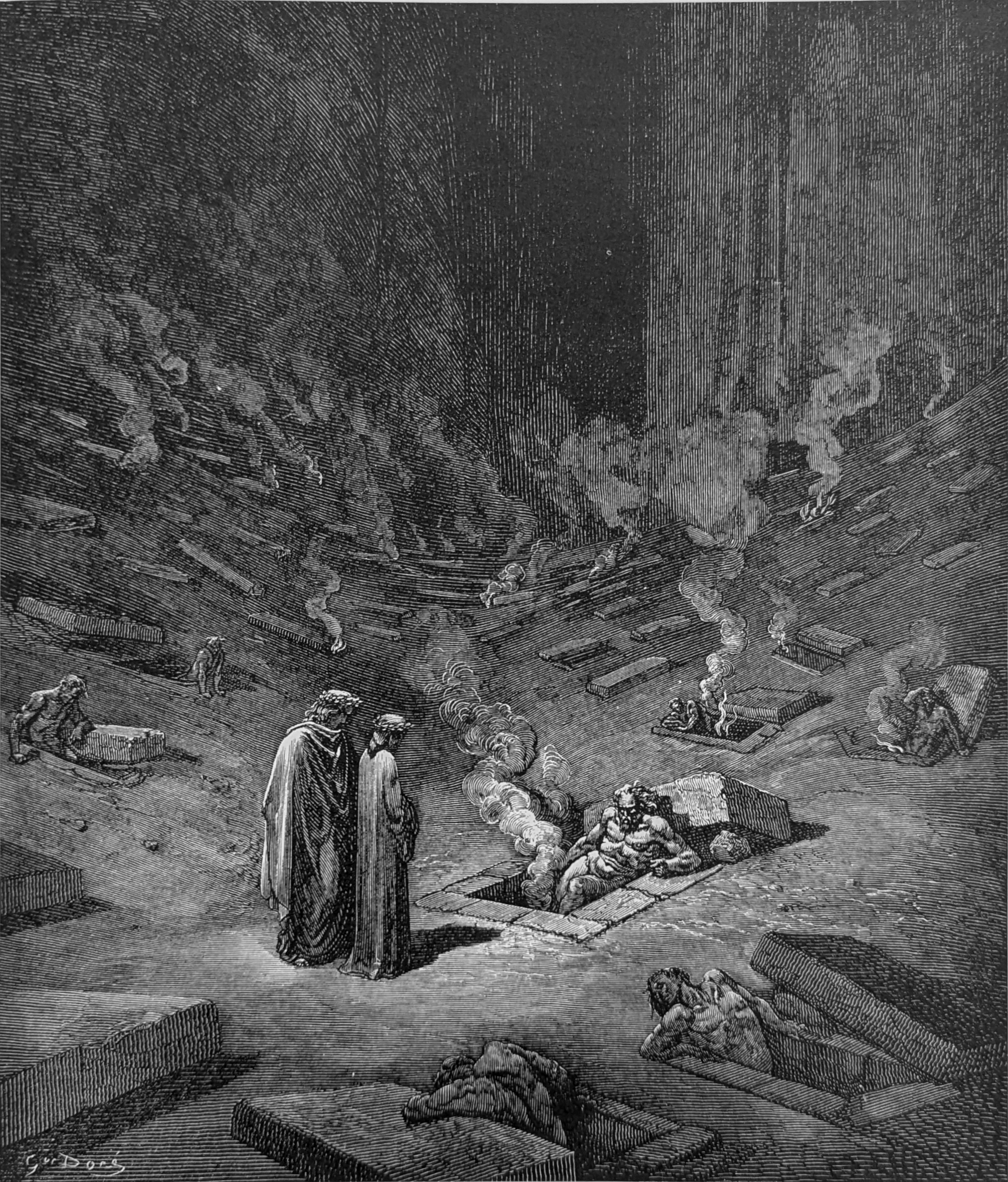"My Master, what are all those people / Who, having sepulture within those tombs, / Make themselves audible by doleful sighs?" Inf. IX, lines 124-126