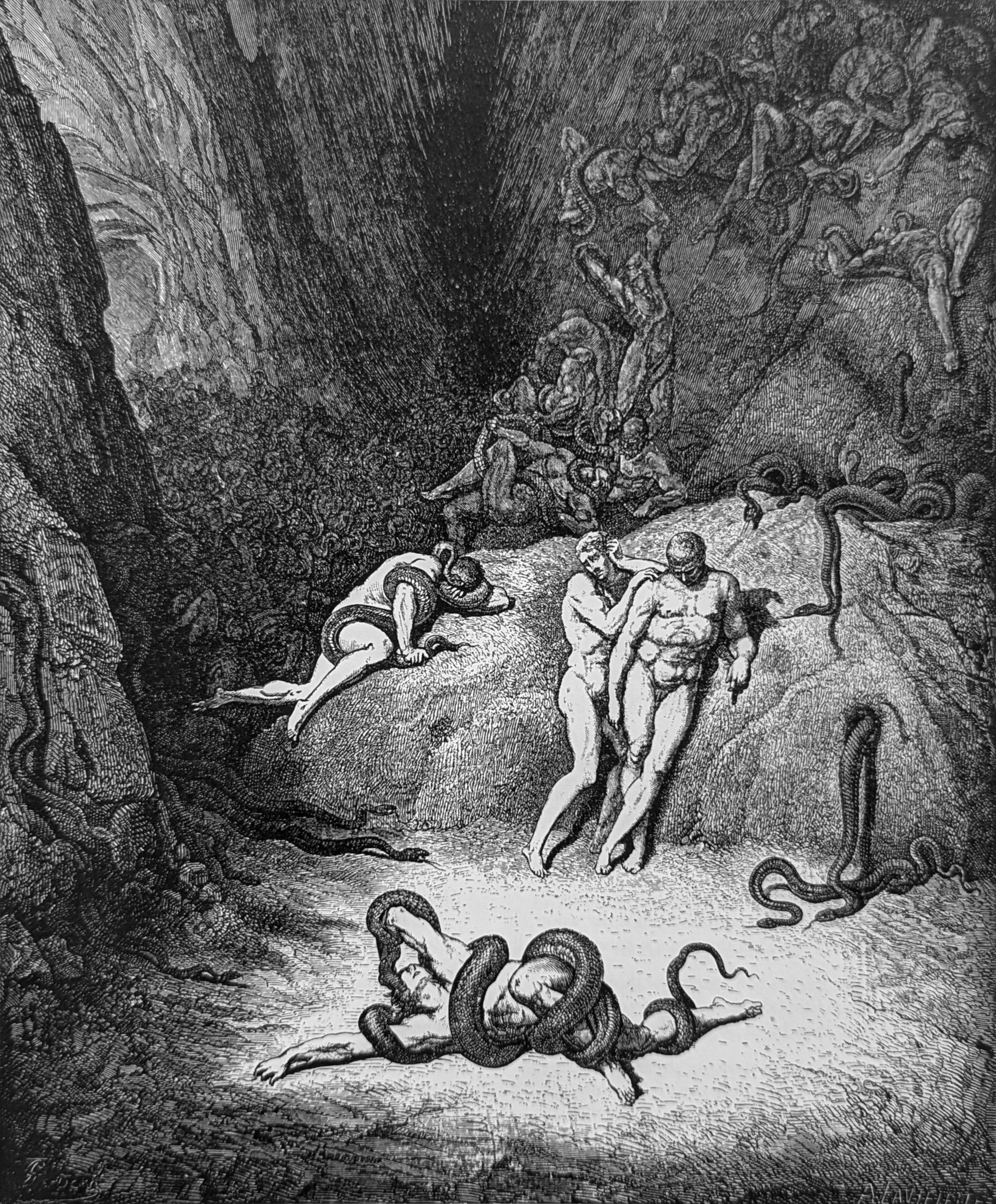 Vanni Fucci, the militant leader from Pistoia, makes an obscene gesture towards God with his fist before being immobilized by a bevy of snakes who wrap themselves around him. When he breaks free, Cacus the Centaur gallops off in pursuit, with a fire-belching dragon on his shoulders. Three shadows appear. They are looking for Cianfa, who appears as a man-become-snake. He attacks Agnello, with whom he merges into one monstrous being. Another shadow exchanges his serpentine form with Buoso. Only Puccio Sciancato retains his shape.