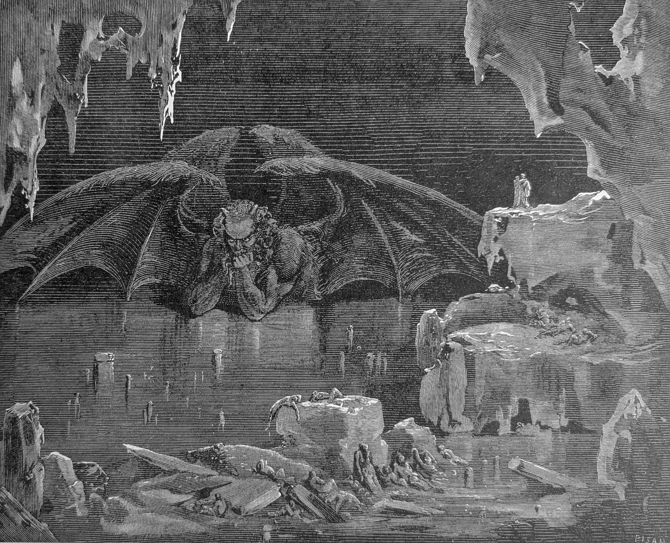 Across the lake can be glimpsed the shape of Lucifer like a windmill through the distant fog. The impotent creature stands alone in Judecca, the fourth division, immobile from the chest down, flapping his wings, each of his three faces chewing one of humankind's worst sinners - Judas Iscariot, who betrayed Christ, and Brutus and Cassius, joint conspirators against Caesar. Virgil carries Dante in piggyback fashion as they climb down Lucifer's back and thighs. Having passed through the center of the Earth, they struggle back up to a cave where a path will lead them to the safety of Mount Purgatory.
