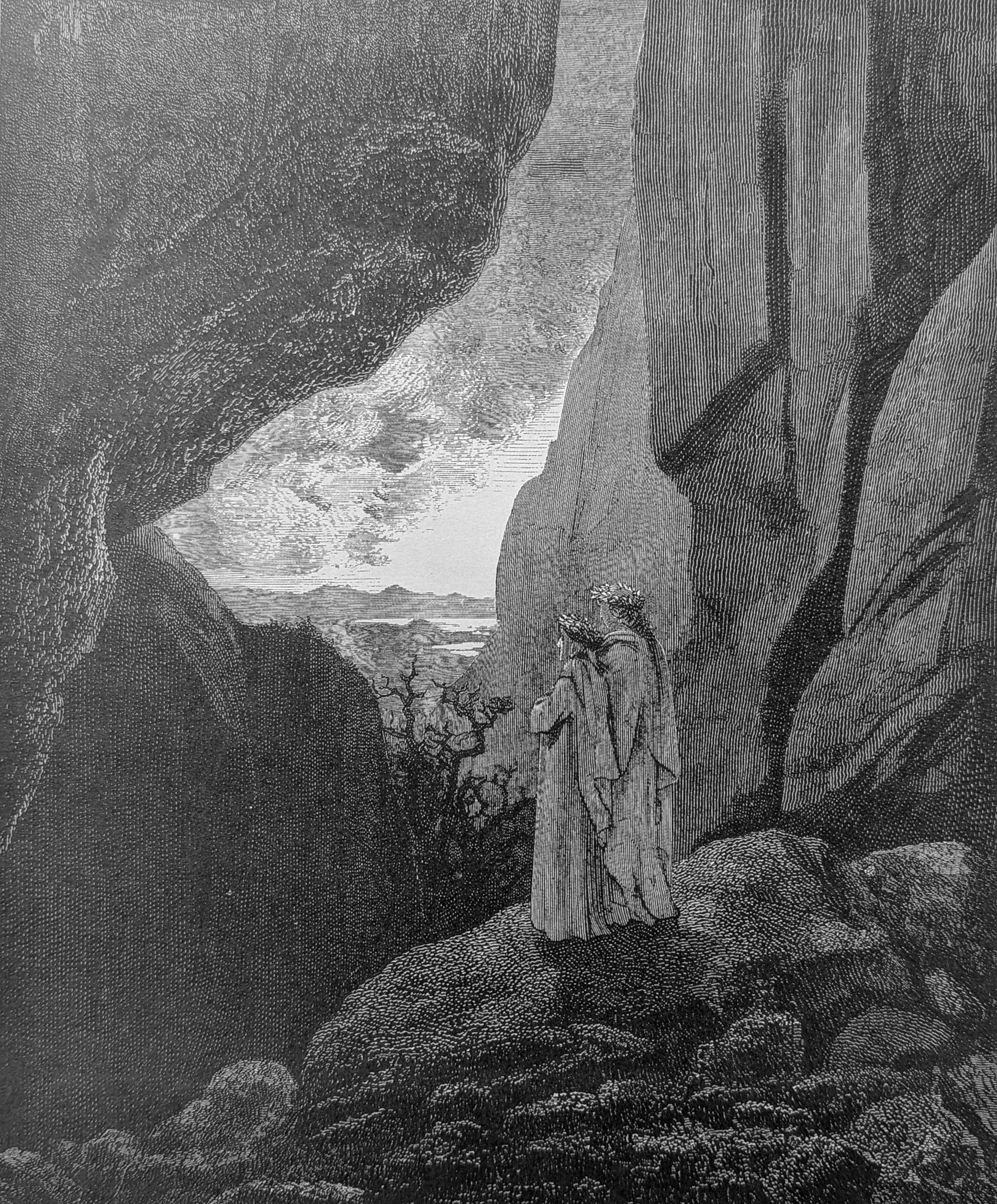 8. Looking back for a moment, Dante and Virgil are standing in a great dungeon on the other side of Judecca, with Lucifer’s legs pointing upward far above them. Dante refers to this as Lucifer’s tomba, his tomb (which, of course, he dug for himself!). However, beyond this dungeon is a long tunnel which most likely marks the path through which Lucifer bored through the earth from the south. Through this tunnel runs a stream that originates at the Mountain of Purgatory above them. Virgil notes that though its waters can’t be seen, they can hear it flowing. Though Dante does not name this stream, virtually every commentator notes that this is the Lethe—the waters of forgetfulness of sin and evil which flows down from the very top of the Mountain of Purgatory. It flows down to join the Acheron, the Phlegethon, and the Styx to form the ice of Cocytus, carrying with it to Lucifer all the sin and wickedness purged from the souls in Purgatory. Though Dante does not state this precisely, at the end of Canto 14, he asks Virgil whether they’ll see the river Lethe. Virgil tells him that he won’t see it in Hell but beyond, where souls wash themselves of their sins and guilt (ll 130-138).