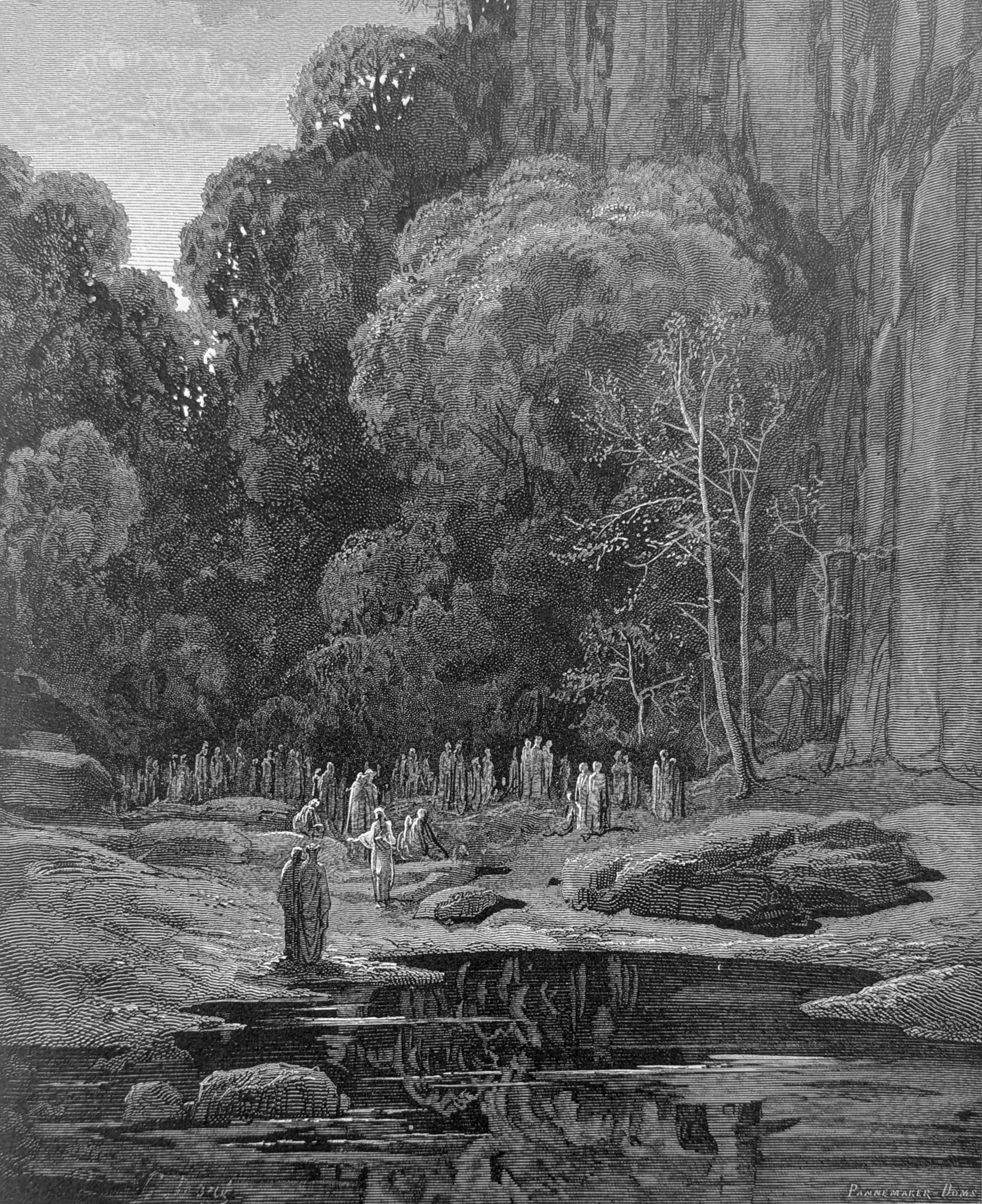 Meanwhile along the mountain-side across / Came people in advance of us a little, / Singing the Miserere verse by verse. Purg. V, lines 22-24