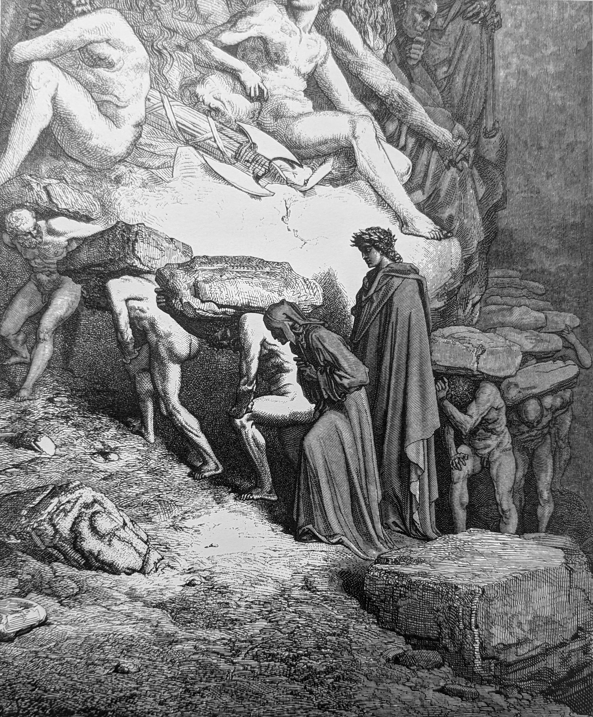 Abreast, like oxen going in a yoke, / I with that heavy-laden soul went on, Purg. XII, lines 1-2