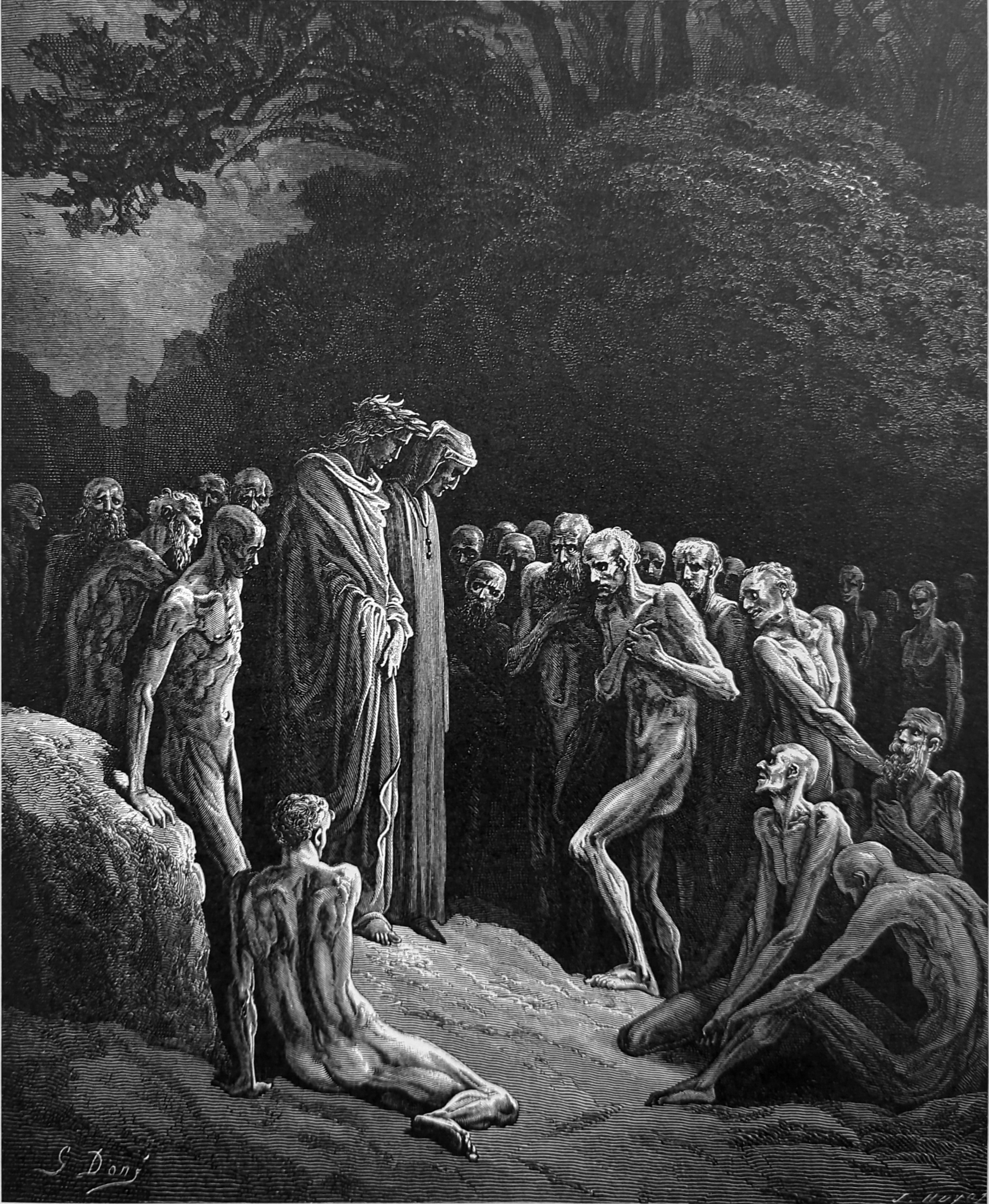 And shadows, that appeared things doubly dead, / From out the sepulchres of their eyes betrayed / Wonder at me, aware that I was living. Purg. XXIV, lines 4-6