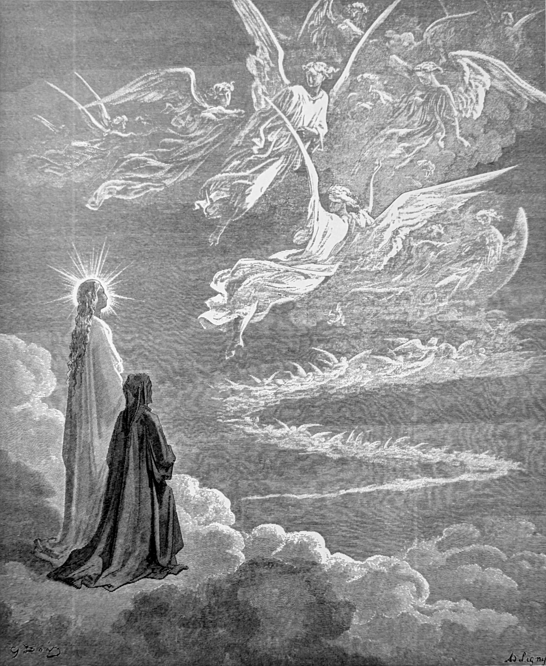 As Beatrice consoles Dante, Cacciaguida calls out the names of eight warrior saints and joins them as they flash along the pattern of the Cross. Dante, and the ever-more-beautiful Beatrice, ascend to Jupiter, the Sixth Heaven. As the planet's silvery sheen replaces the ruddy glow of Mars, Dante beholds a spectacular display of lit-up letters (the souls of the Just) spelling out "Diligite justitiam qui judicatis terram" (Love justice, ye that judge on Earth). The final 'm' reconfigures into the imperial eagle, symbol of justice. Dante accuses the Pope of abusing his holy office.[1]