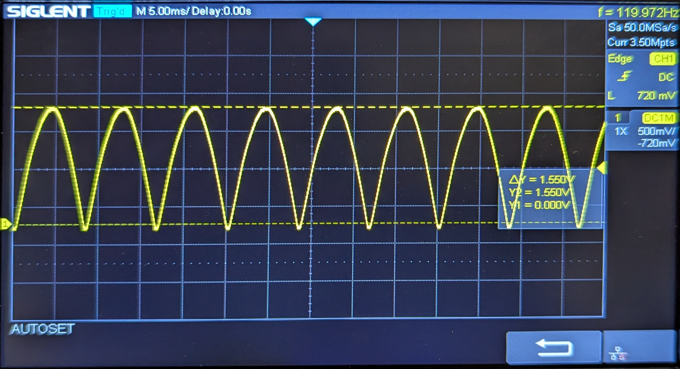 The voltage is recorded at 1.55V which is less than 2V due to diode D1. The effective voltages is approximately 1.03V, or 2/3 of the peak voltage.
