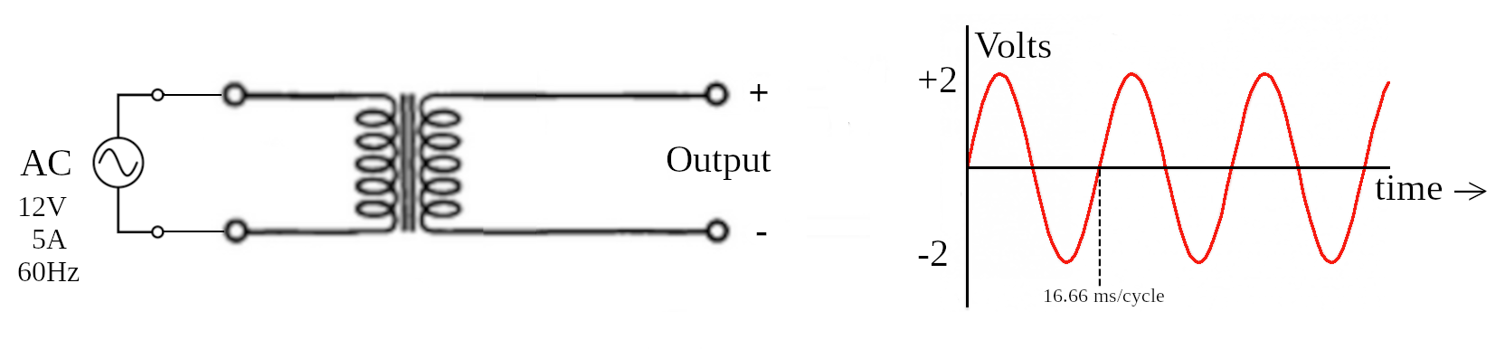 An AC source comes from a transformer that takes 120V from the wall outlet and produces 12V, 5A at 60Hz. This produces a sine wave on the oscilloscope with a peak positive of 2V and peak negative of -2V, with a cycle of 16.66 msec per cycle.