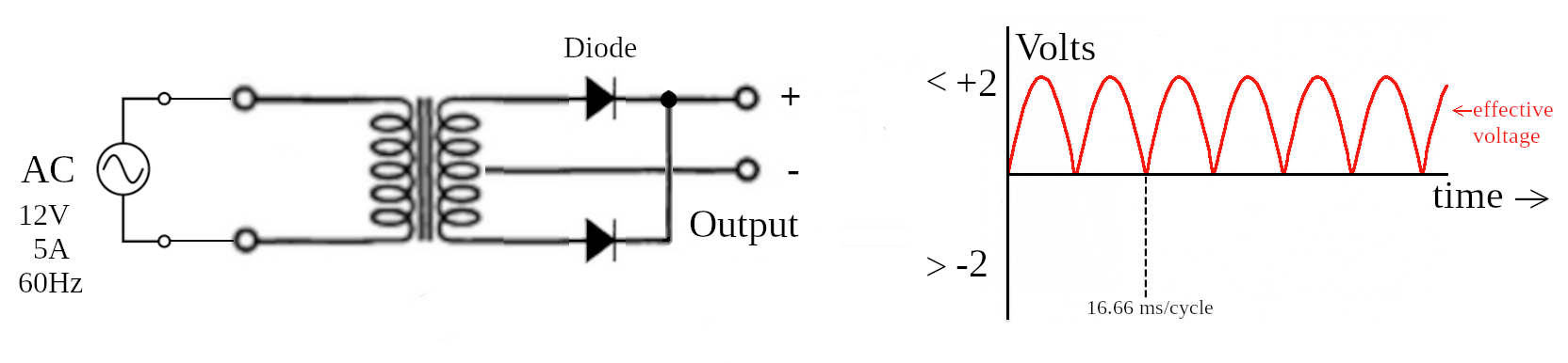 Placing a diode on the positive electrode produces a saw-tooth pattern. During the positive phase, the diode is forward biased and lets current through; however, when the diode is in the negative phase, it is reverse biased and does not allow any current. This produces an interrupted saw tooth pattern. The effective voltage is roughly 1/2 the peak voltage.