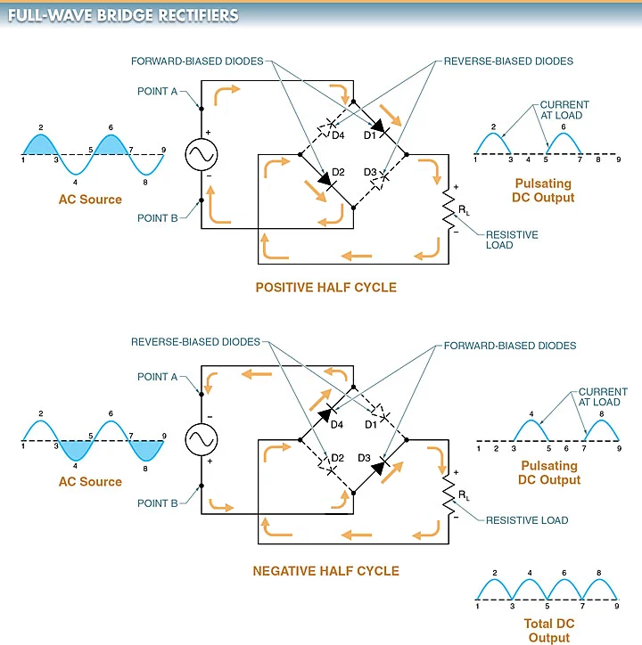 A Full-Wave Bridge Rectifier takes an AC power source without tapping the center and produces an uninterrupted saw tooth pattern. This is accomplished using a diamond-shaped pattern of diodes to break the positive and negative currents into two separate pathways.
