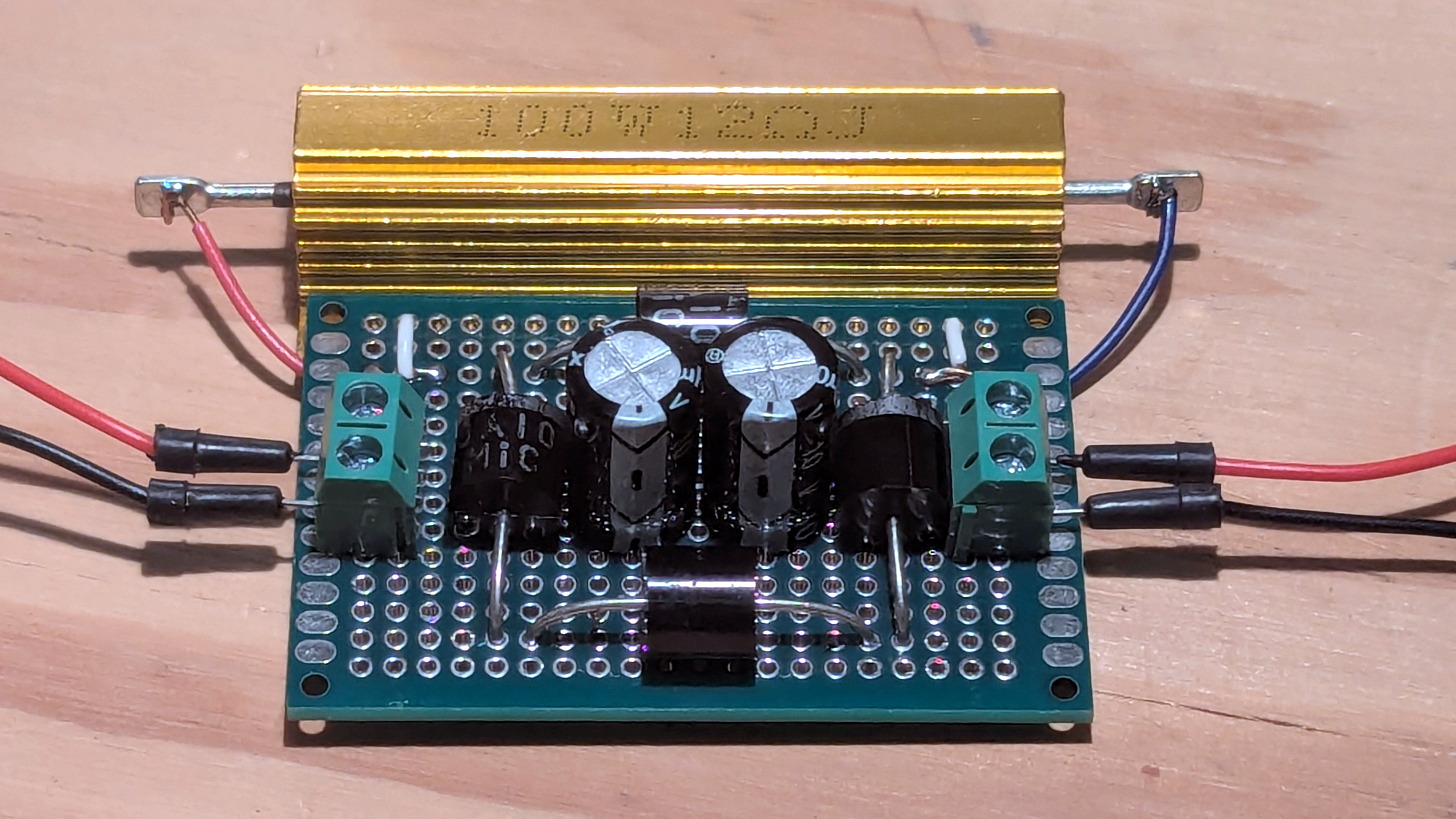 Using Schematic #2 (above), I have constructed this prototype. Looking from above, you can see the leads for the AC voltage coming from the left, the four diodes forming a square, the large 12 Ohm resistor (gold), and the two 2200 uF capacitors in the center. The DC current leads are to the right: red is positive and black is negative.