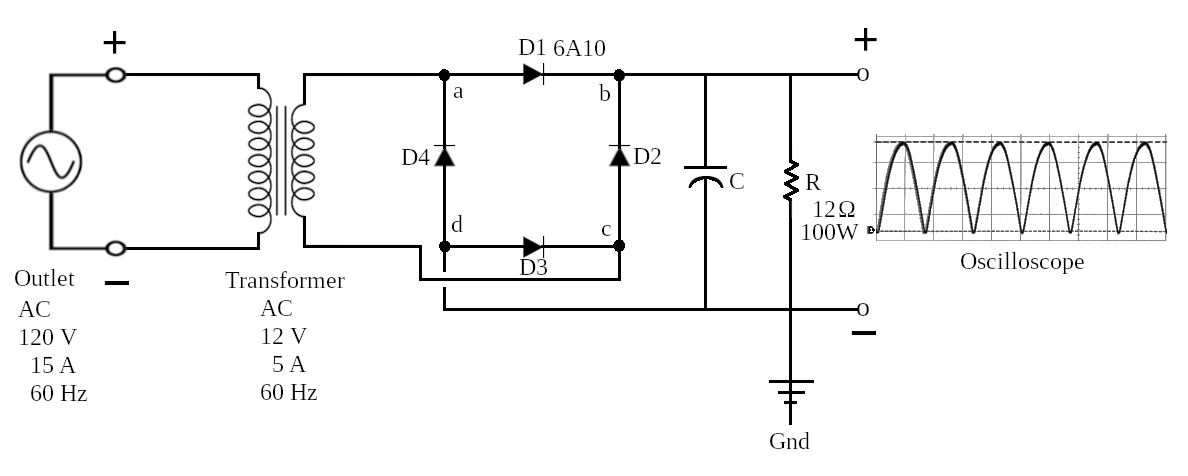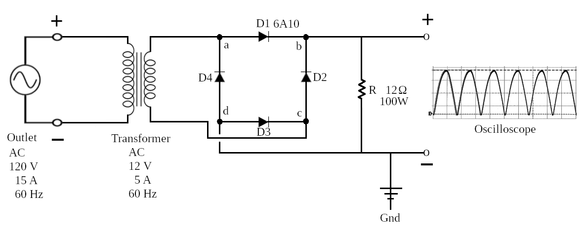 Note: point b is the positive end (during the positive portion of the sine wave) and point d is the negative. These should be attached to the oscilloscope for measurement. Point a is attached to the positive lead of the transformer and point c is attached to the negative lead.